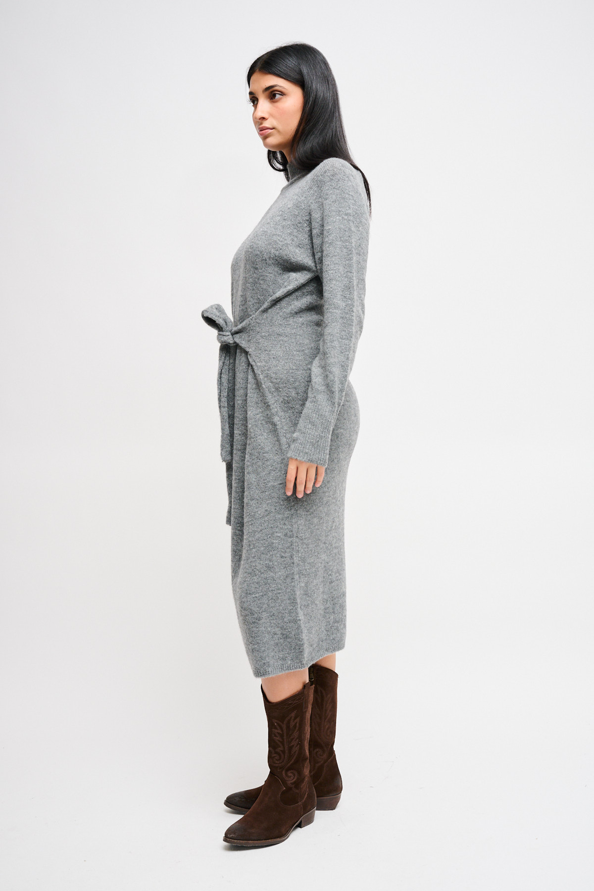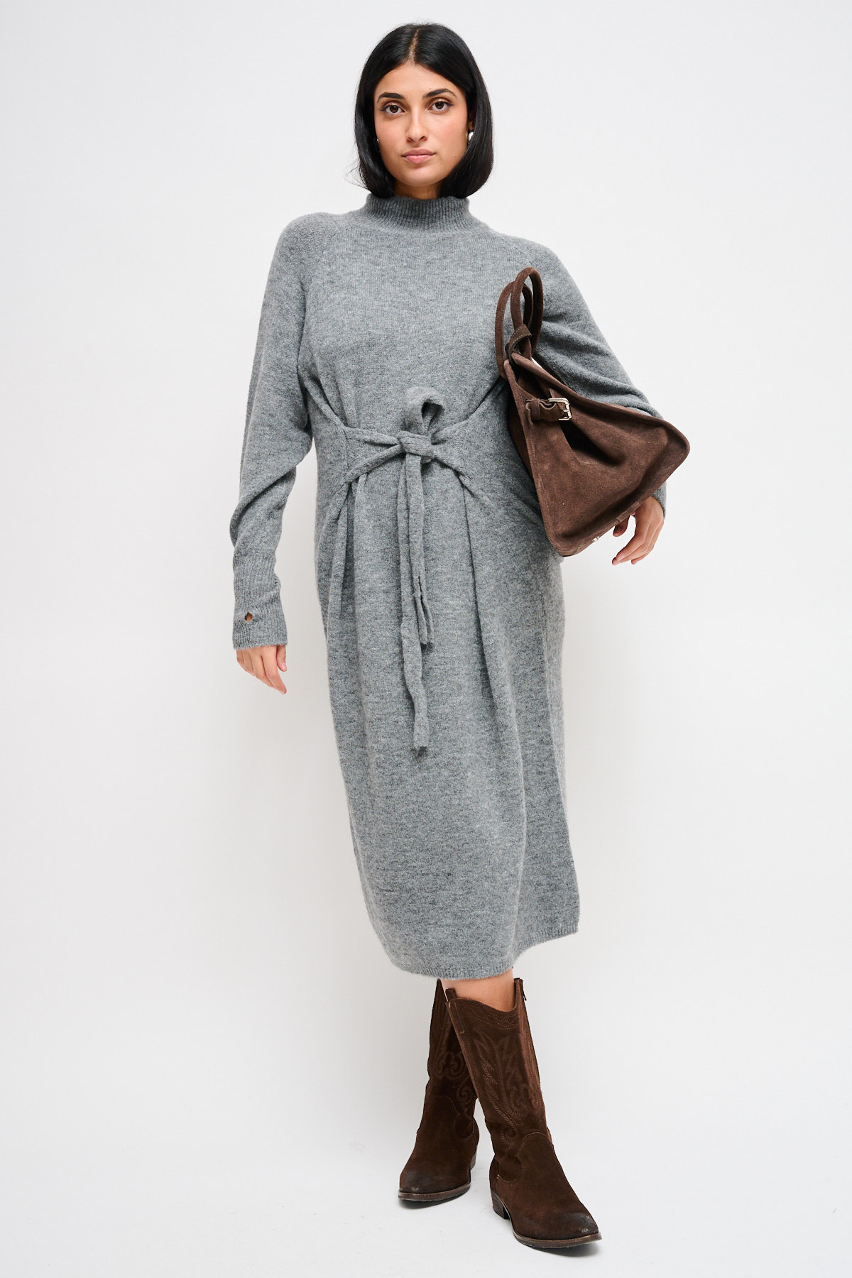 This knit dress is a must-have for the cold season. The high neck and long sleeves offer maximum comfort, while the belted waist defines the silhouette. A versatile dress, perfect for daytime looks, combining warmth, style, and sophistication.