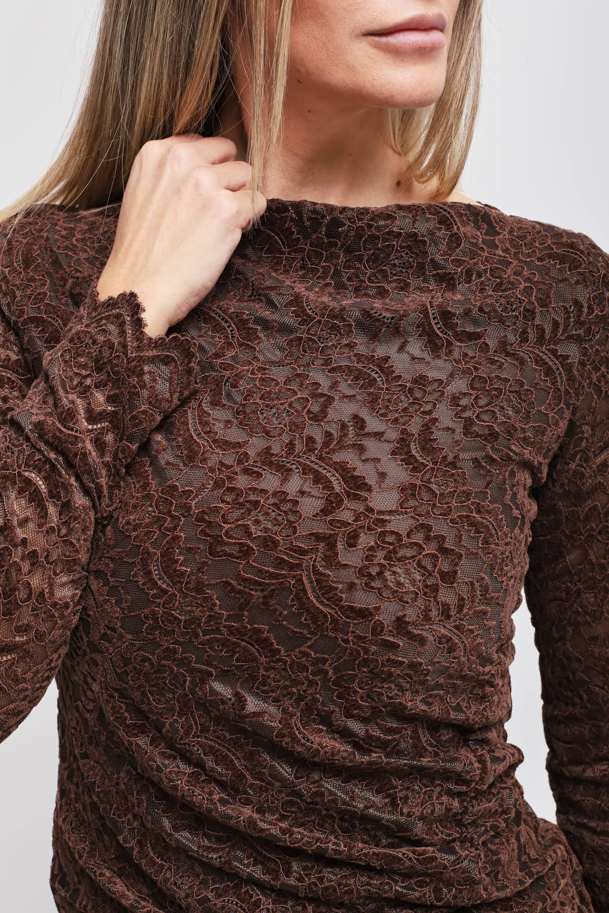 Long-sleeved lace midi dress, ideal for any evening occasion. The elegance of the high neckline meets the sensuality of the deep side slit, ensuring a distinctive and sophisticated look.