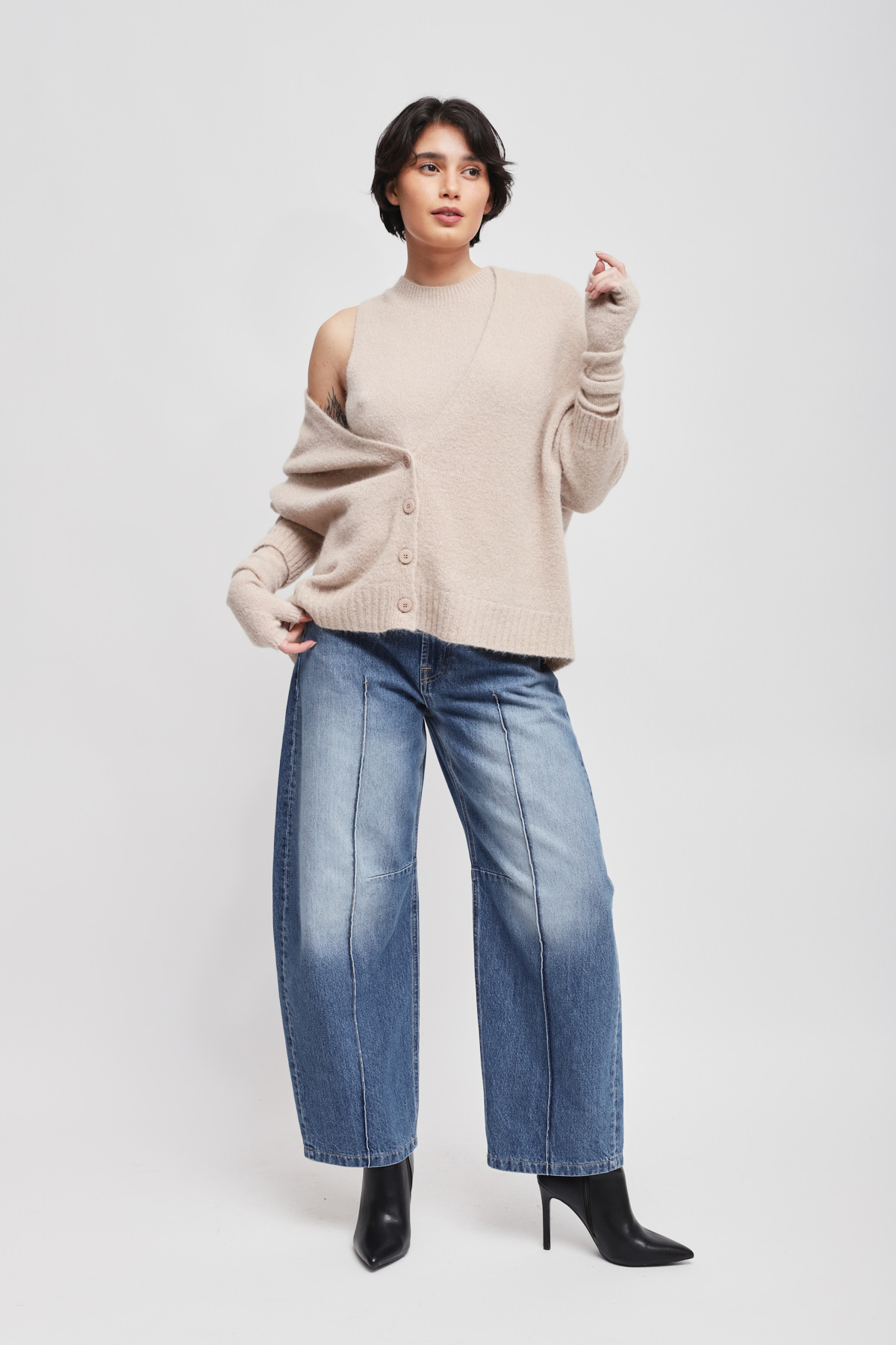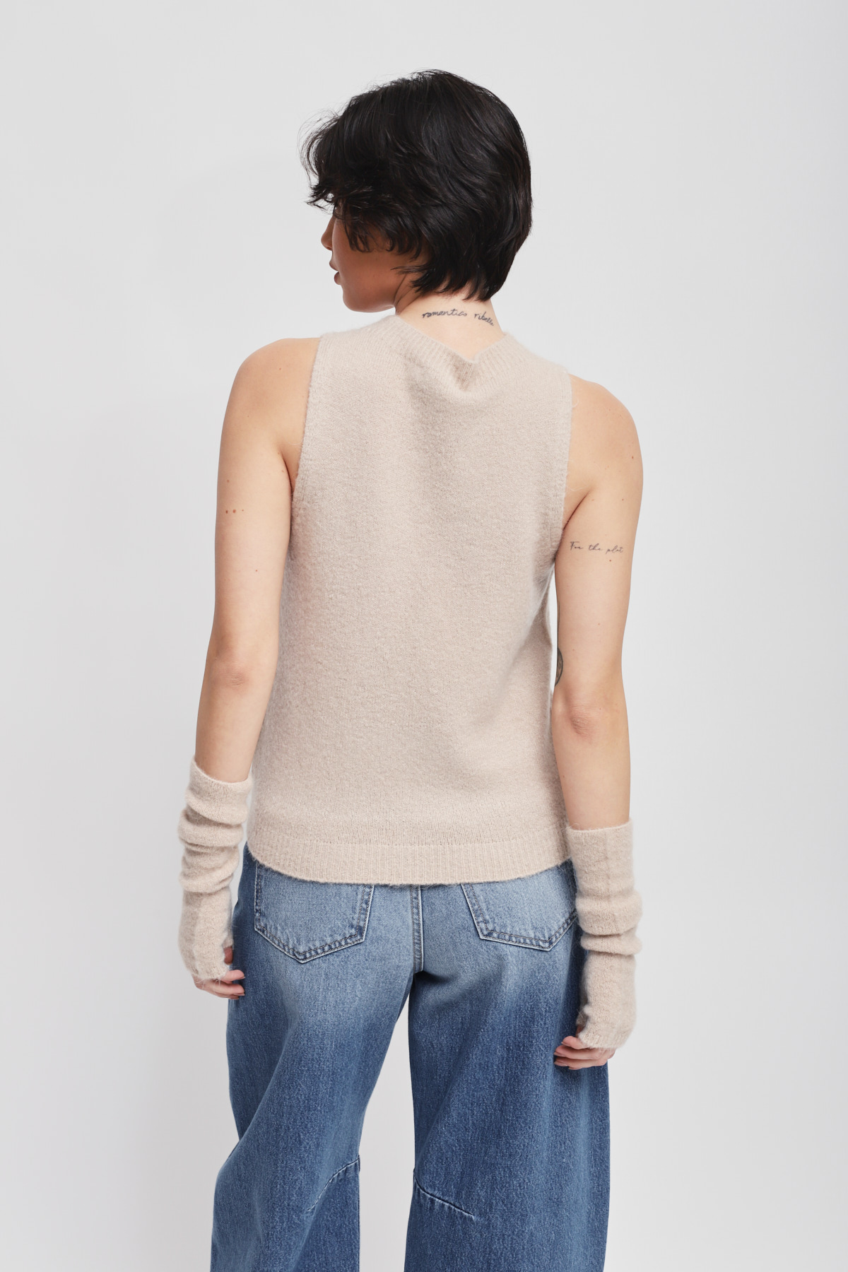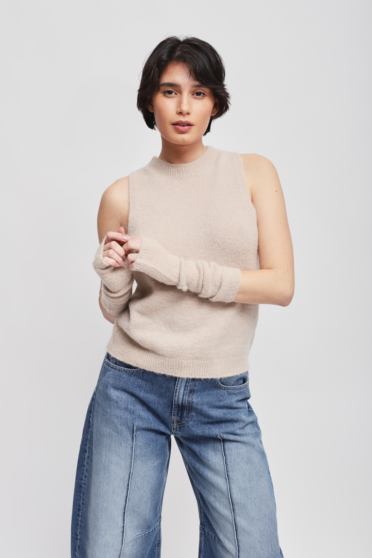 Sleeveless knit top with removable sleeves, perfect for creating a contemporary and chic layered look. The crew neck design and slim fit offer snug comfort, ideal for wearing with wide-leg denim for a sophisticated everyday outfit.