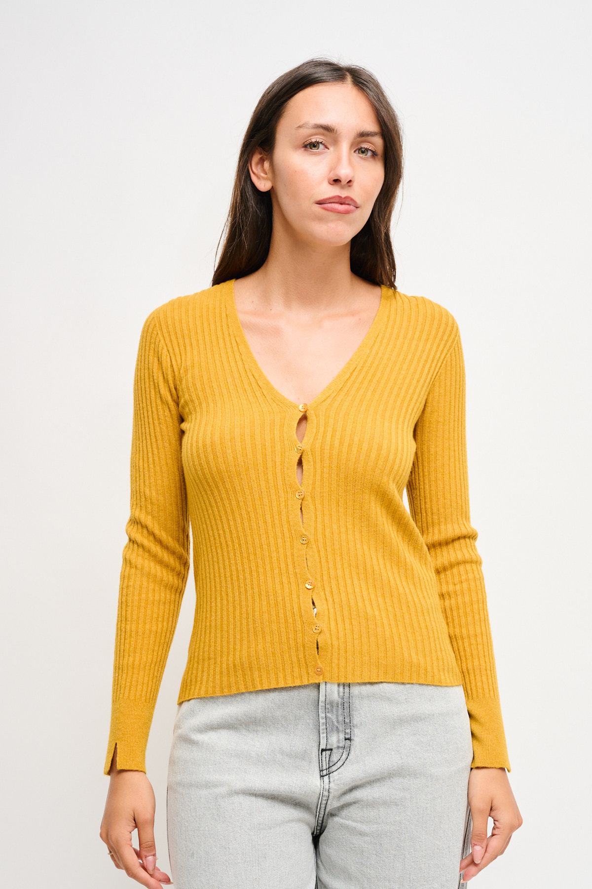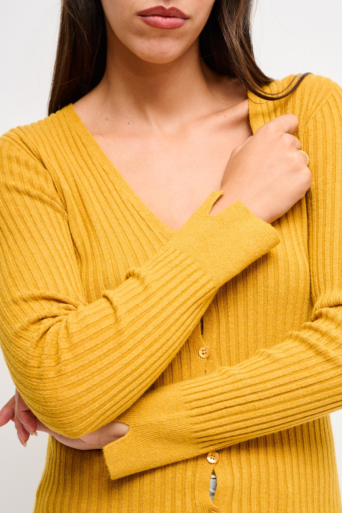 Slim-fit ribbed cardigan with a V-neck and front button closure. The stretch fabric flatters the figure, making it an ideal piece to wear alone or under a jacket. It combines comfort and chic style, perfect for completing everyday looks with denim or tailored trousers.