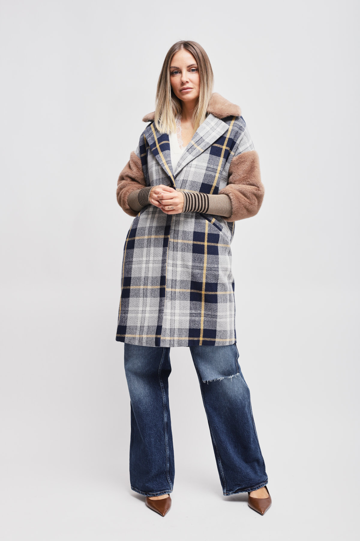Single-breasted checked coat, a versatile outerwear piece with a contemporary silhouette, perfect for casual-chic looks. The refined faux fur details on the collar and sleeves lend a warm, original, and striking touch.