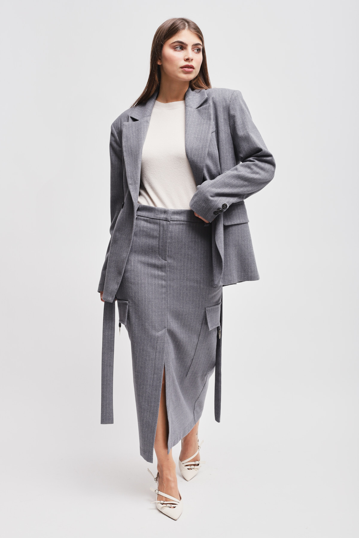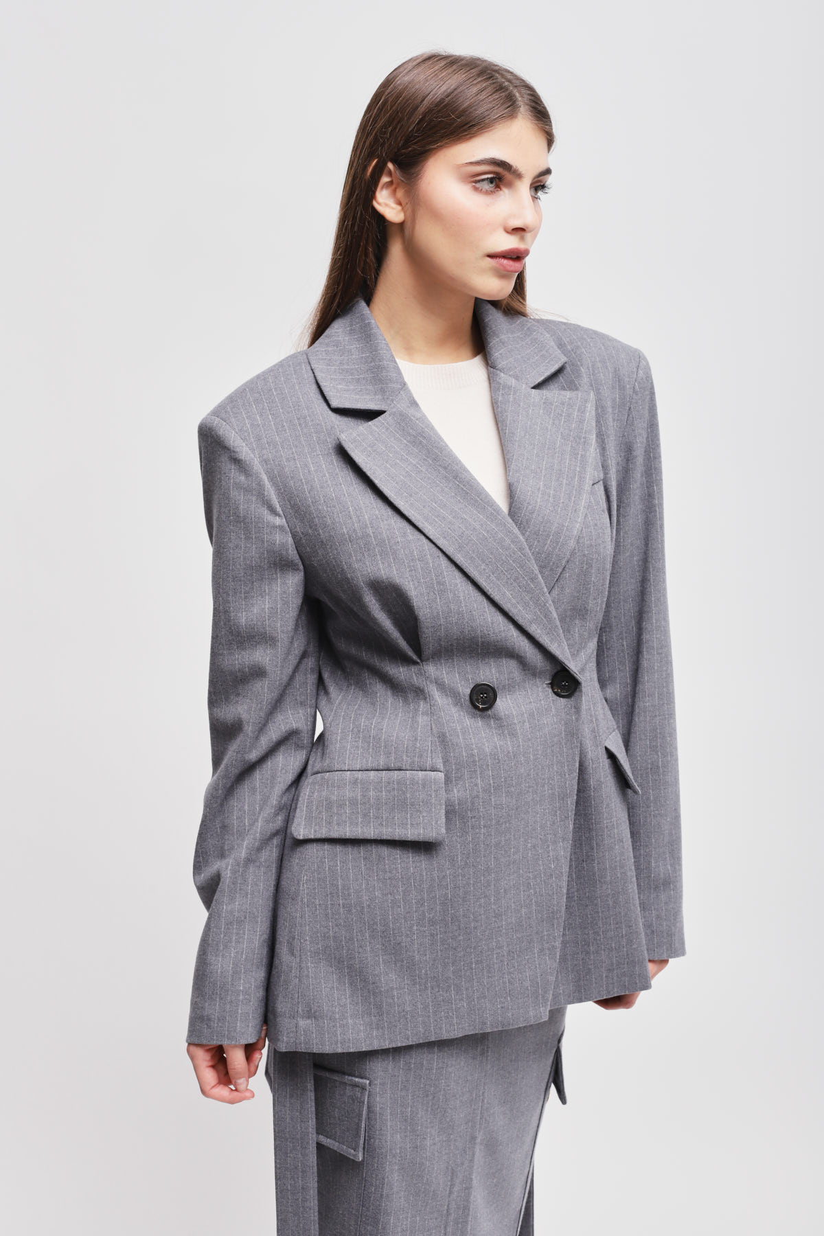 Double-breasted blazer in pinstriped fabric, the distinctive back pleat closure defines the figure with a tailored touch. An elegant and modern must-have, ideal for enhancing any formal look with style.