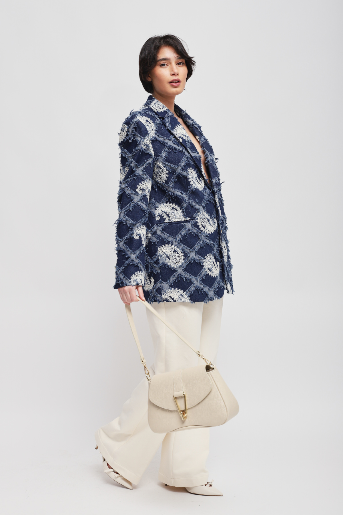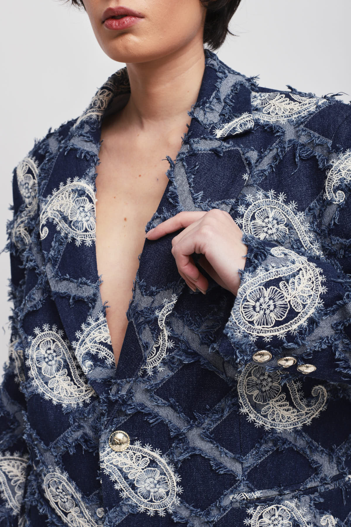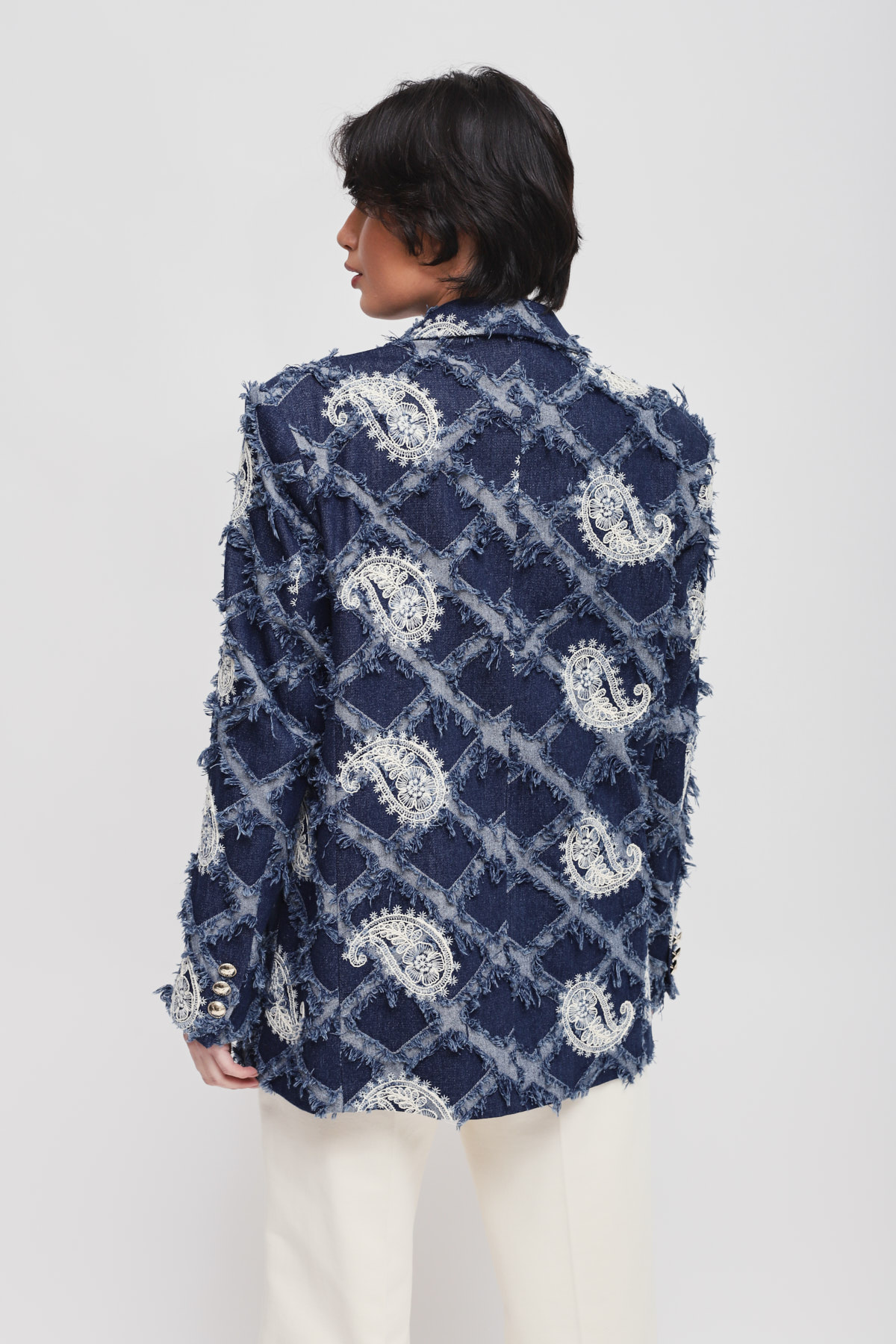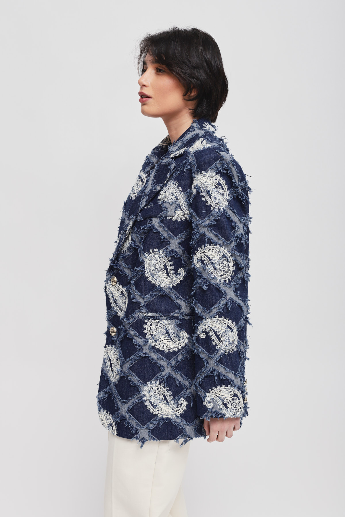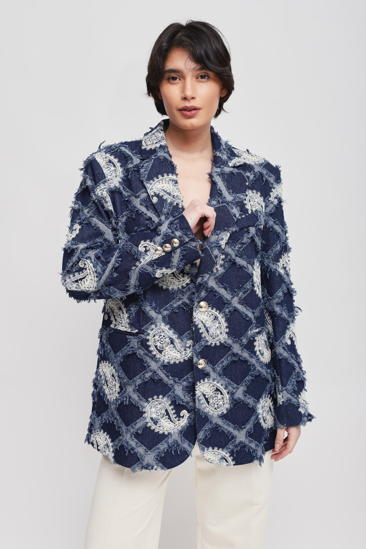 Blazer with paisley embroidery and a raised fringed texture, ideal for those seeking a distinctive look. Gold buttons add a touch of sparkle, while the structured cut enhances every outfit with character and originality. A sophisticated style choice to boldly elevate your seasonal outfits.