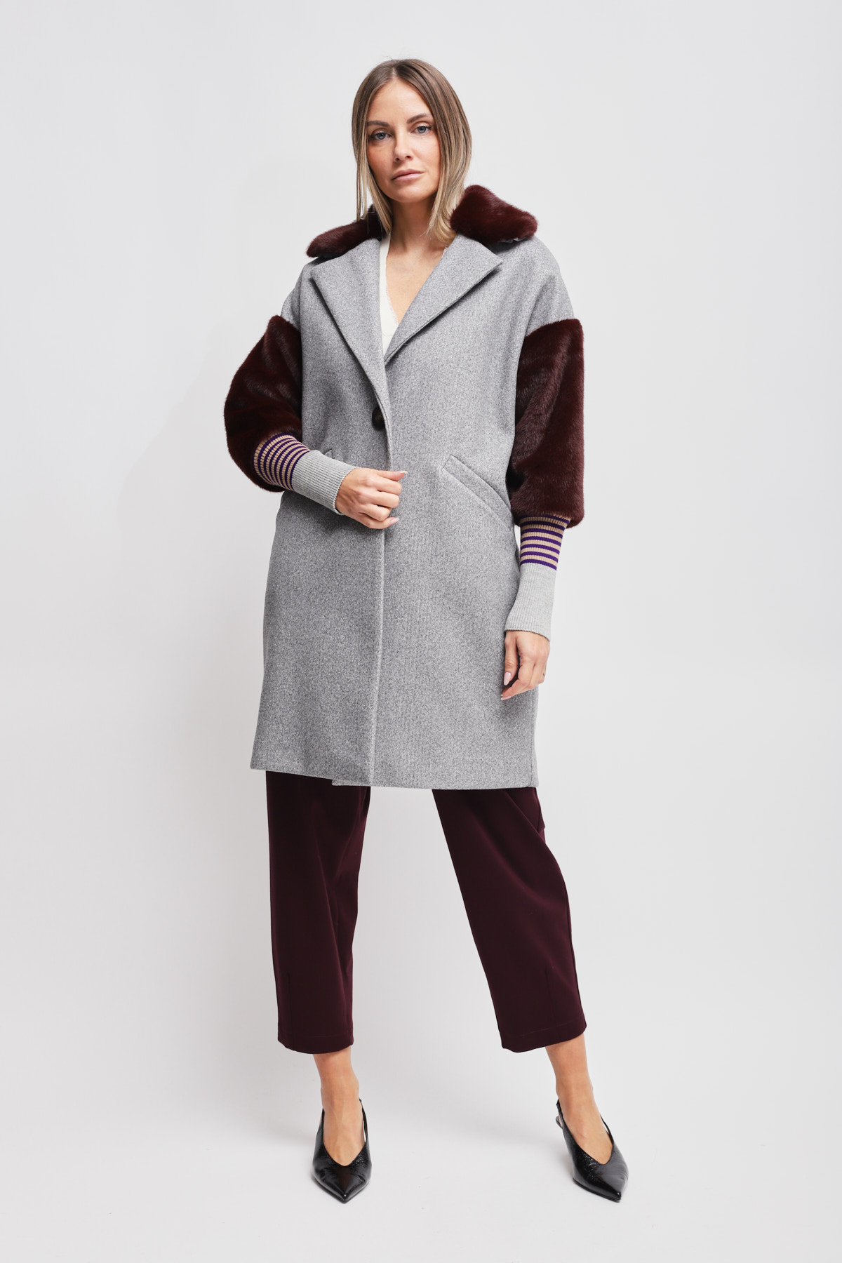 This single-breasted coat stands out for its elegant, structured line. The faux fur details on the collar and sleeves add a sophisticated, trendy touch to the outerwear. A versatile and striking piece, an essential for your winter wardrobe.