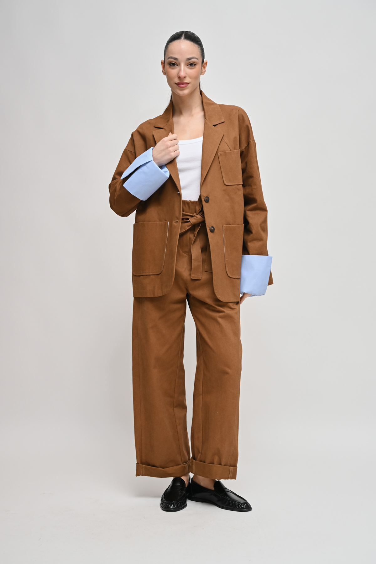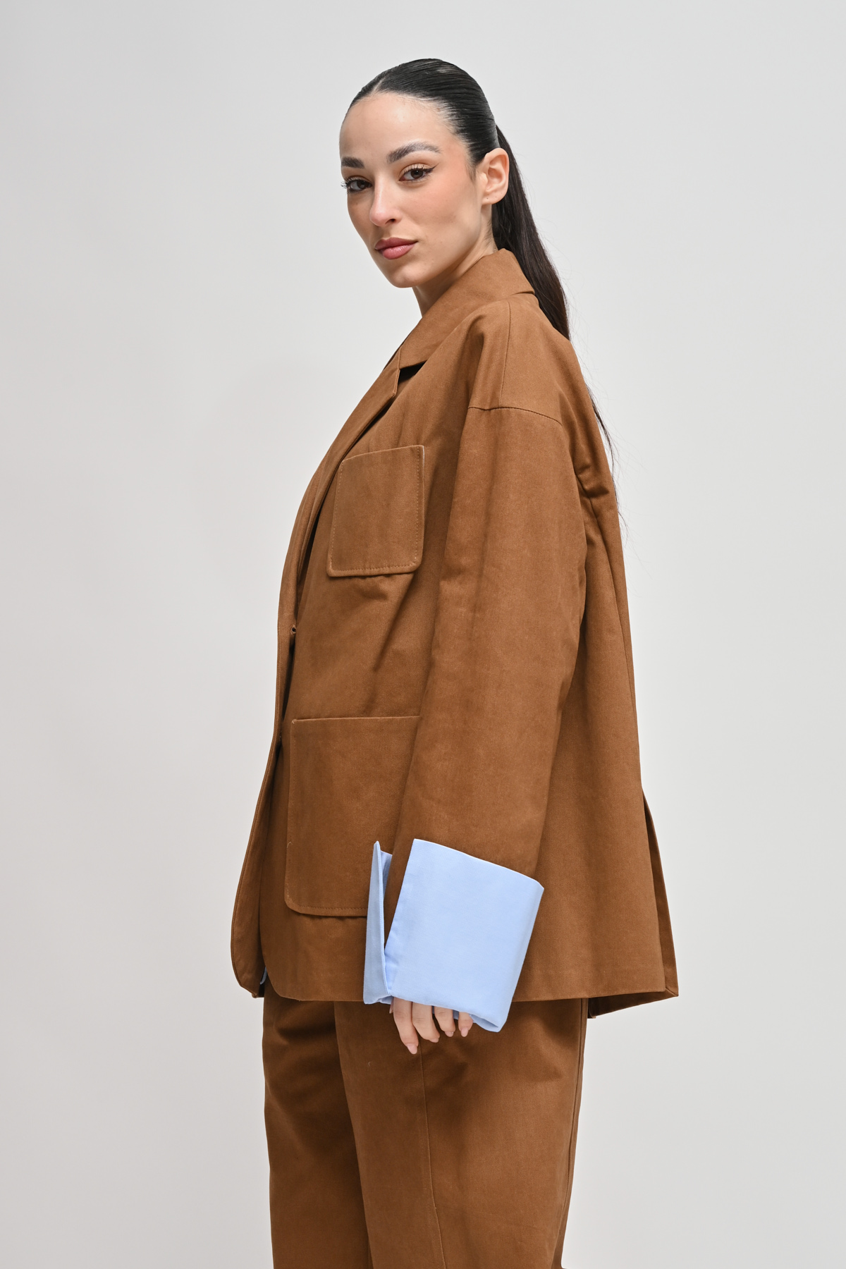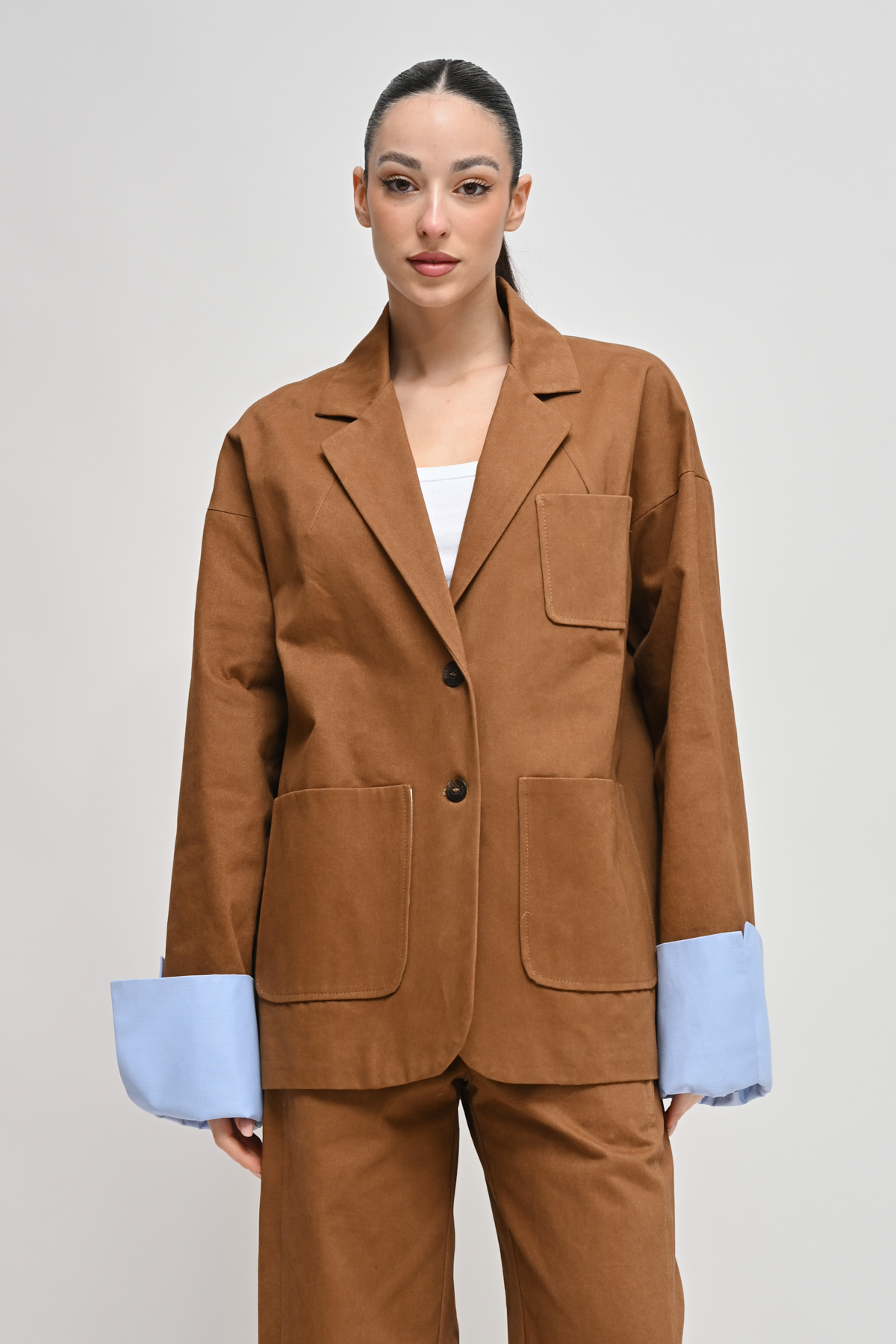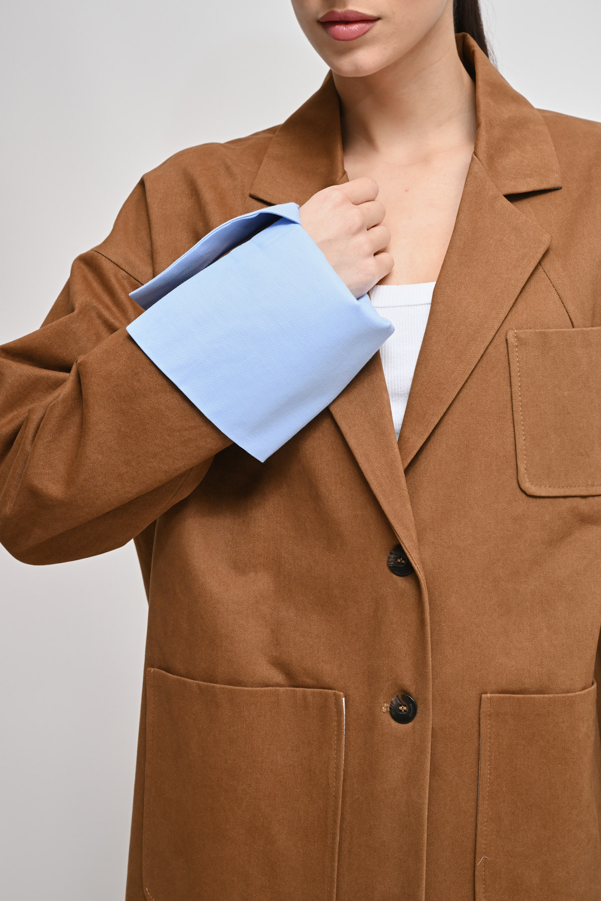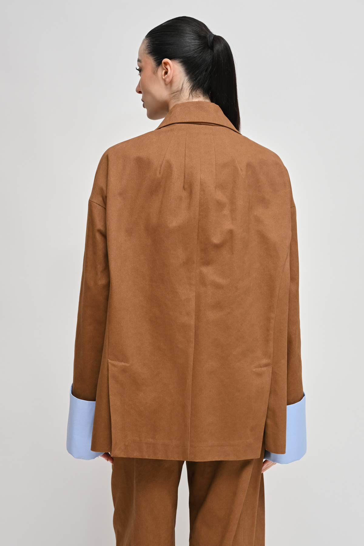 Contrasting cuffs add a contemporary and original touch to the structured silhouette.