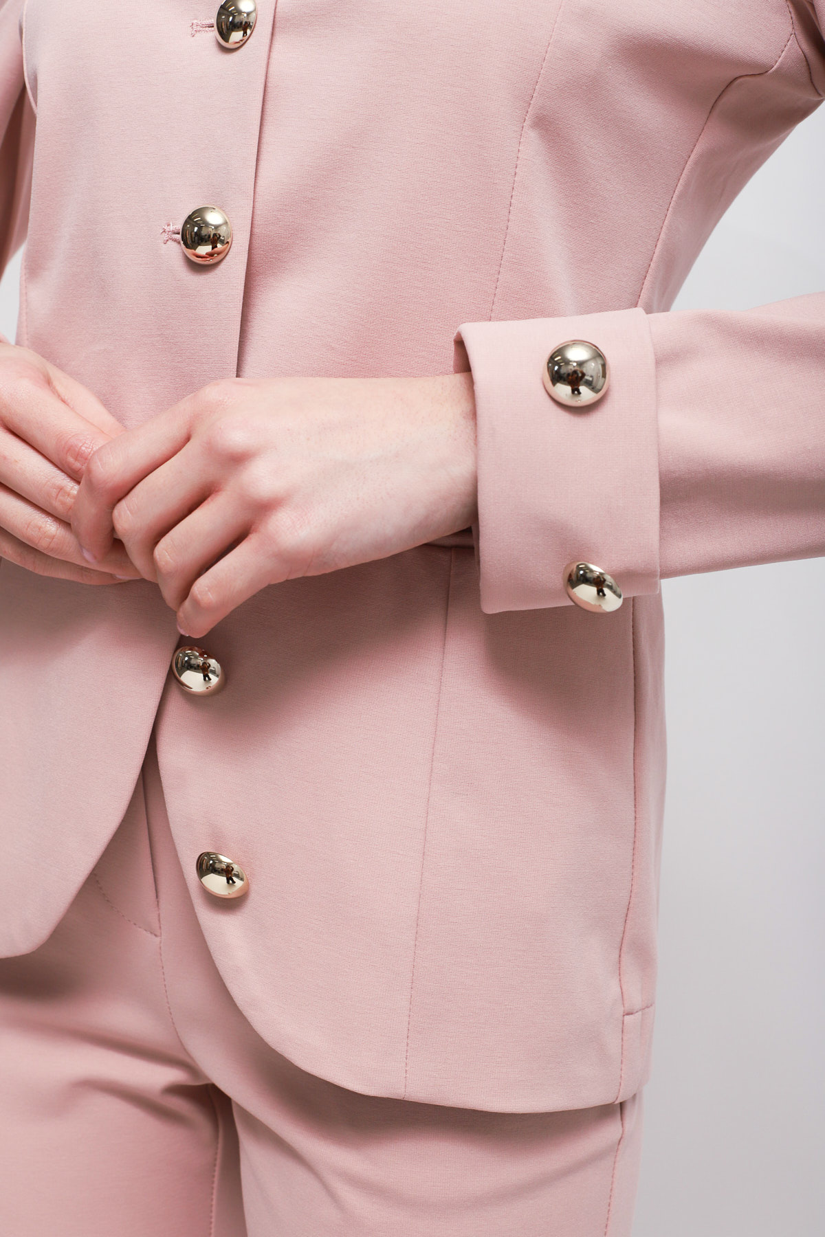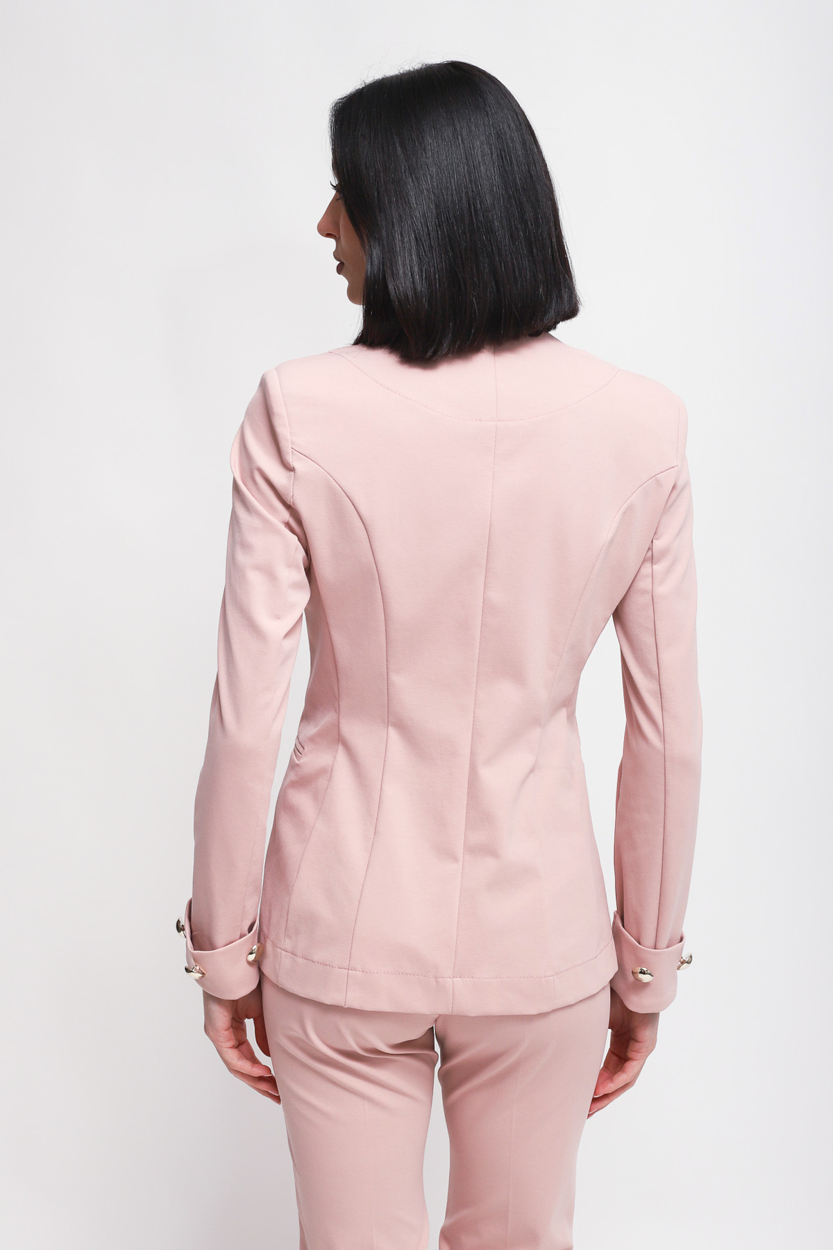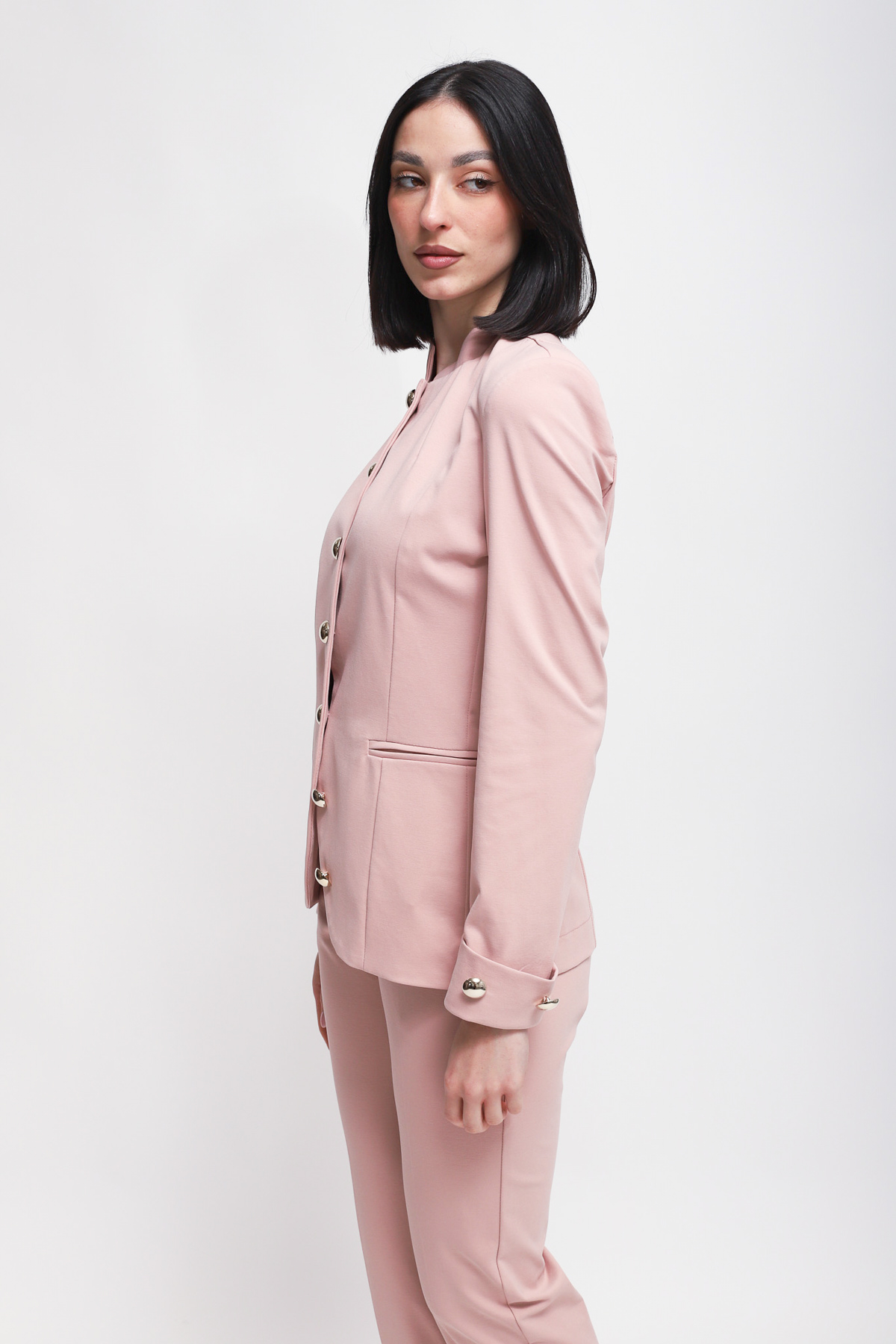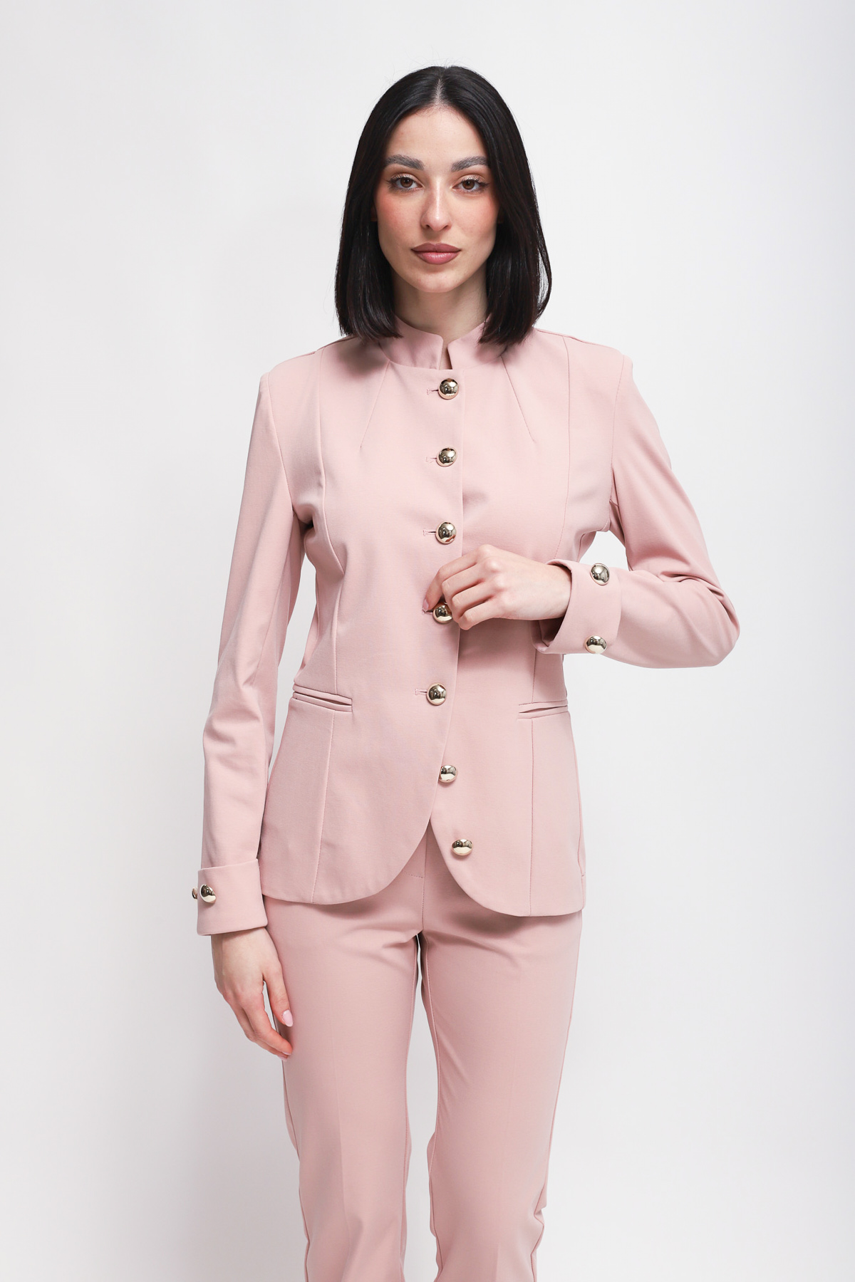 Fitted jacket with a mandarin collar and single-breasted closure. The design features metal buttons decorating the center and cuffs, complemented by side welt pockets.