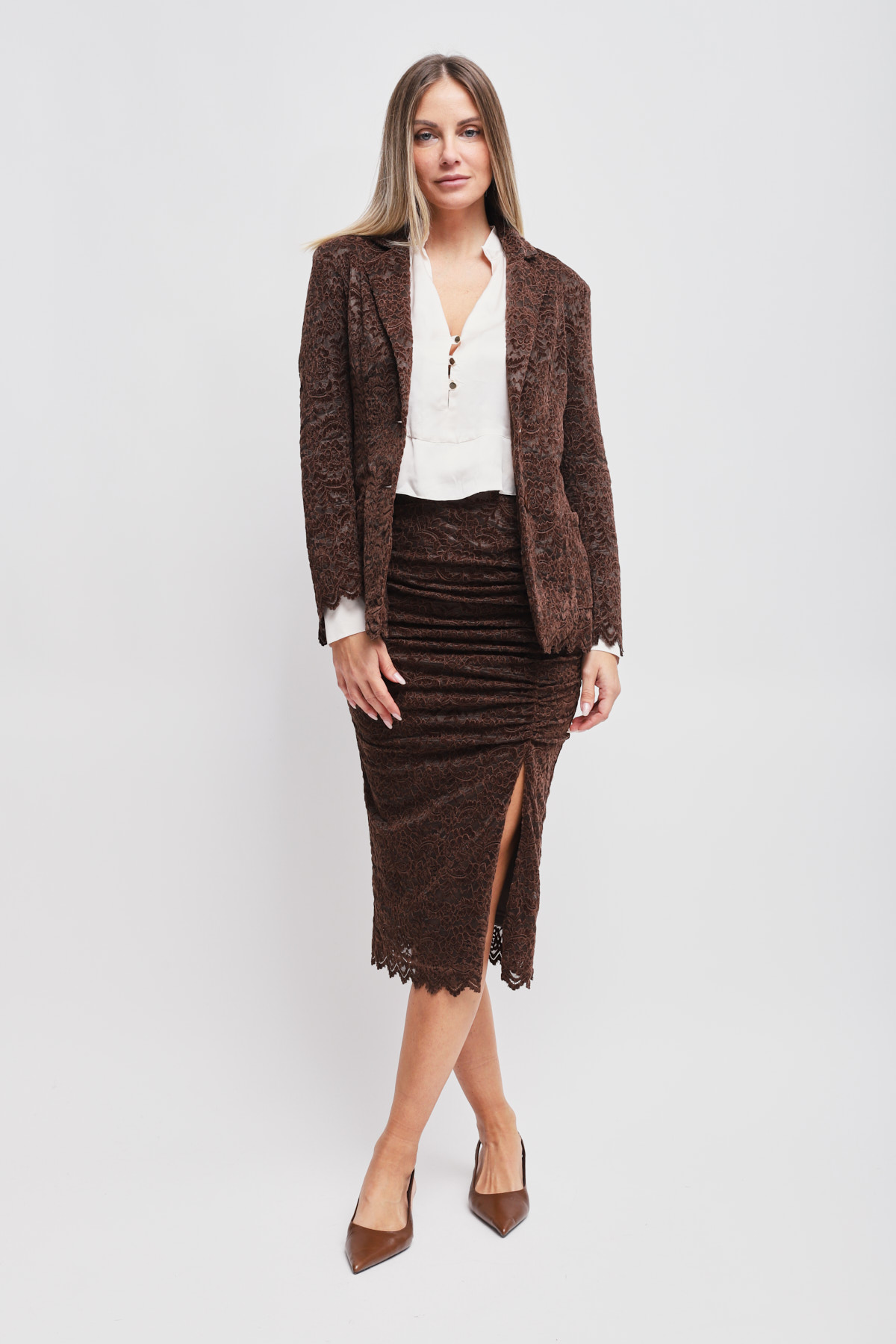 Precious lace blazer, a highly refined outerwear piece designed to be worn with the matching skirt for an elegant ensemble. The textured texture enhances the clean lines, making it a distinctive piece for an evening look. It adds a sophisticated touch to formal attire.