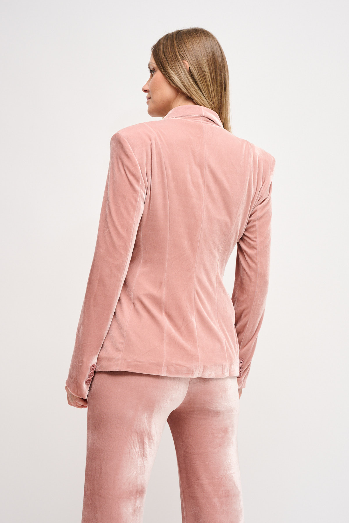 Elegant blazer in smooth velvet, featuring a deep V-neck that accentuates the décolleté. The fit is defined and contoured, with a single button closure at the front and flap pockets at the sides for a clean and sophisticated silhouette.