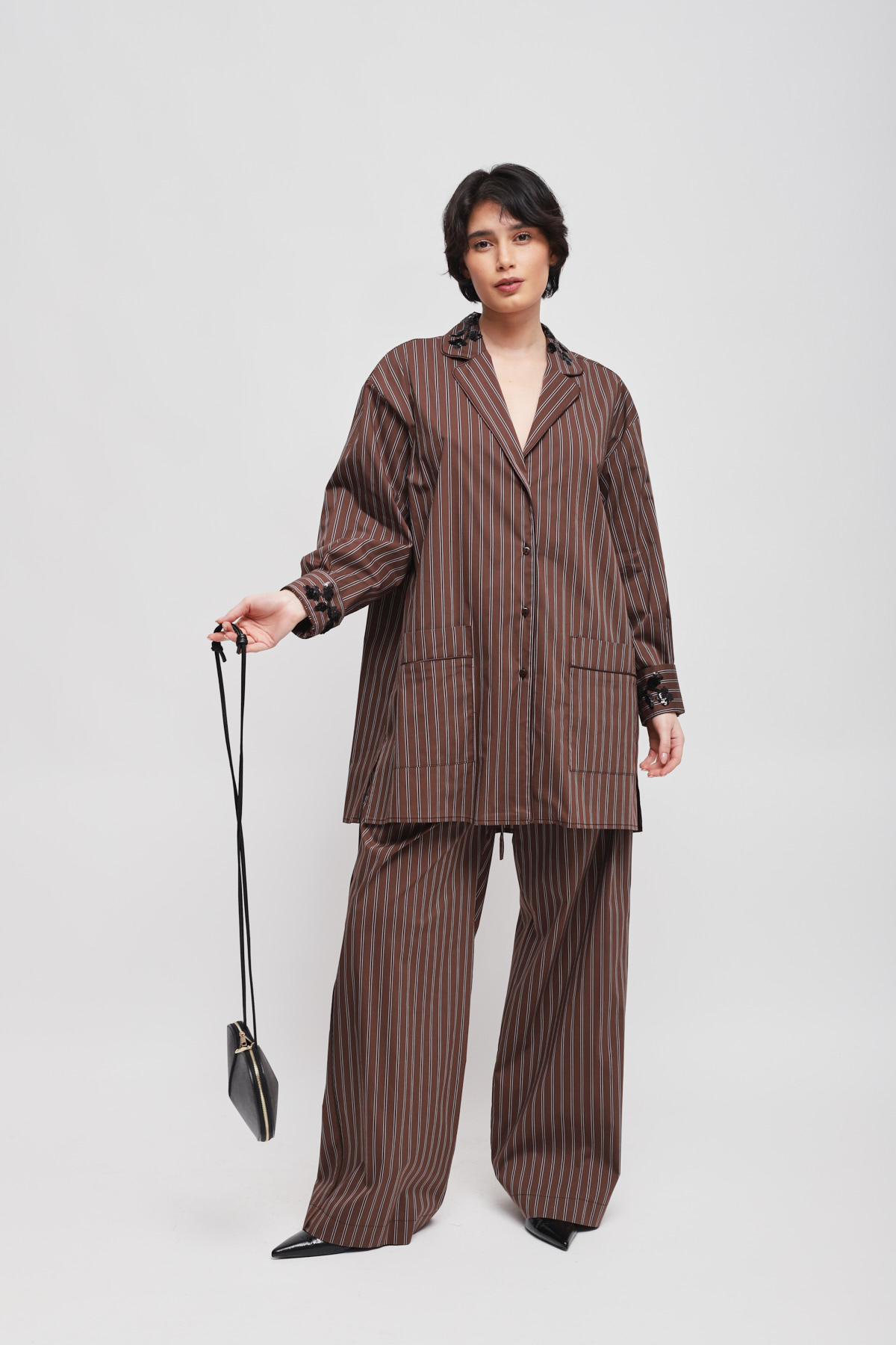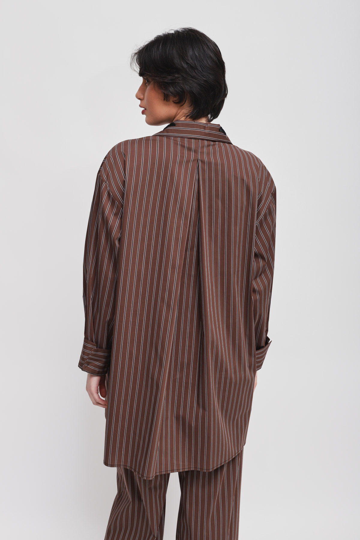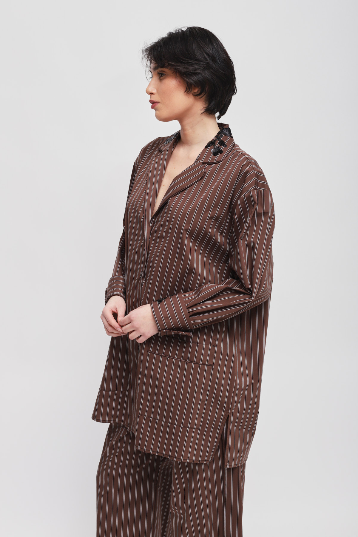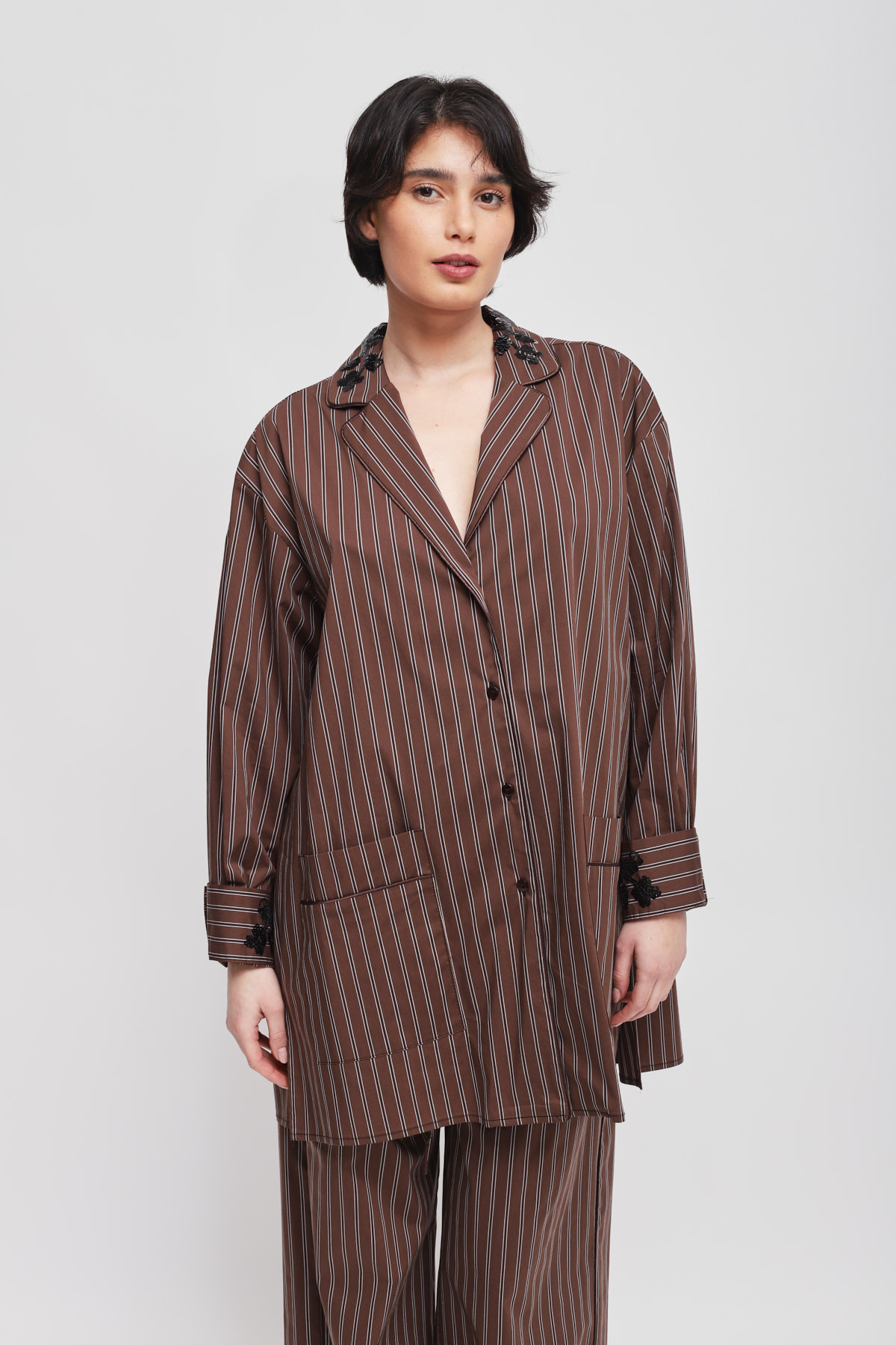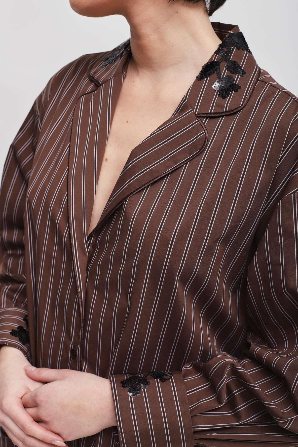 Oversized, tailored shirt, embellished with a classic, fine-striped pattern that lends a professional, chic allure. The sophisticated, contrasting floral embroidery on the collar and cuffs elevates the design, making it perfect for those who want to stand out with class.