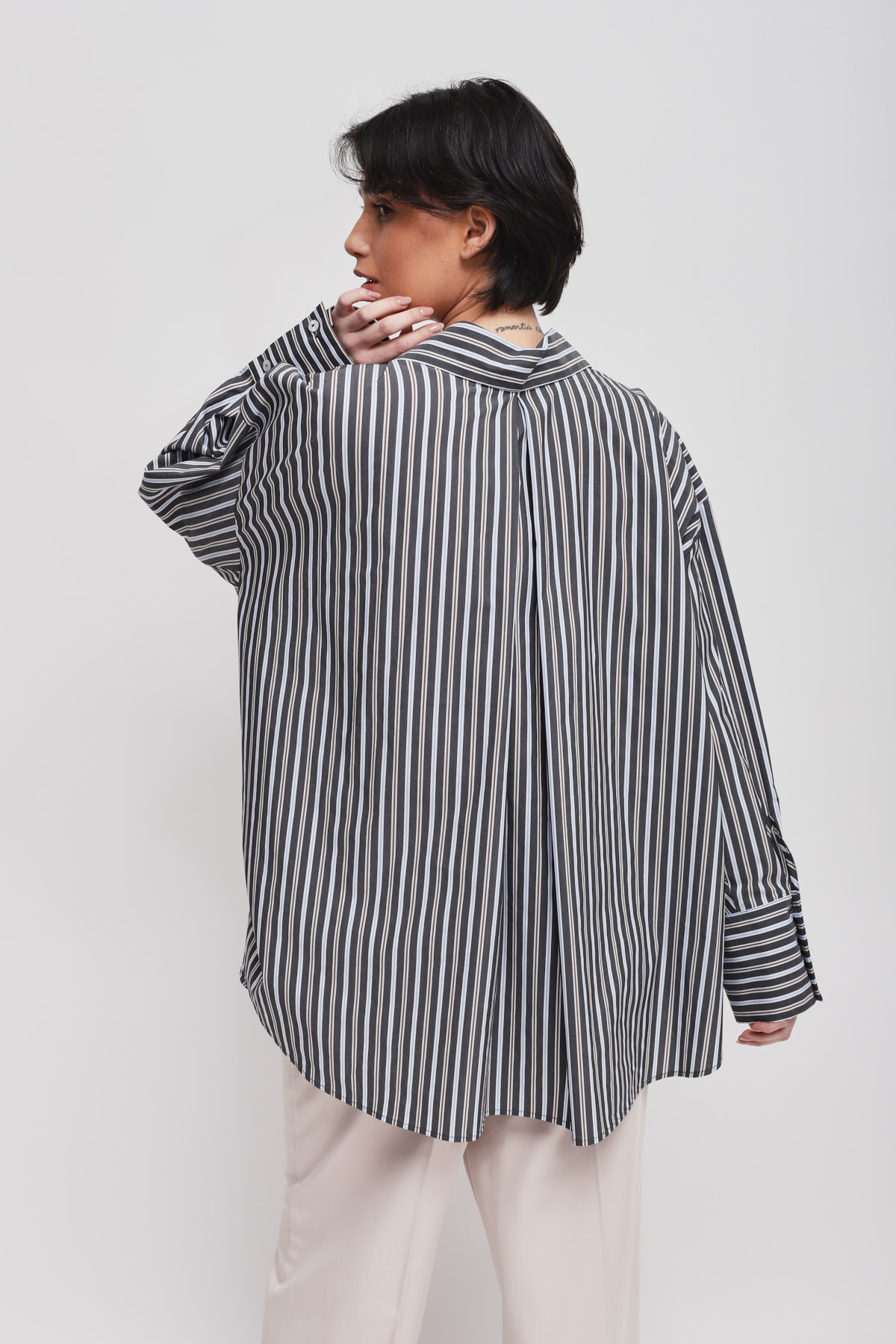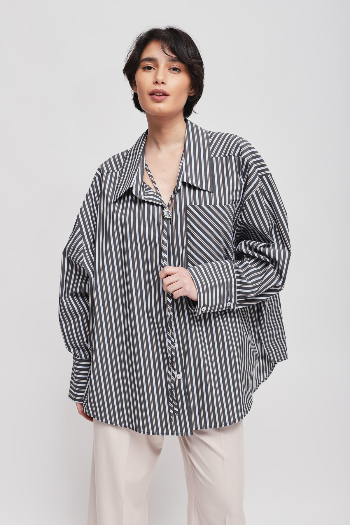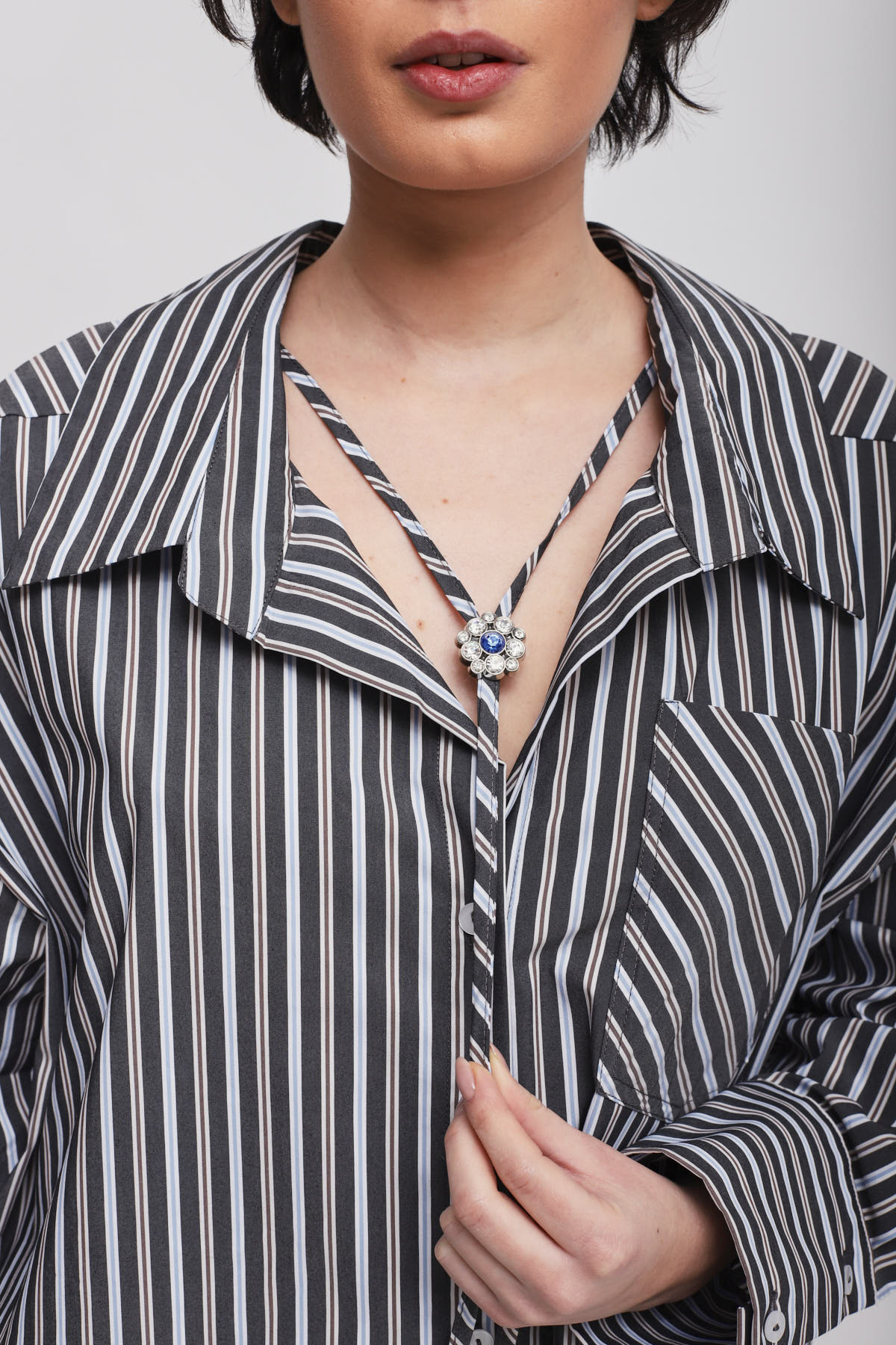 HOME > CLOTHING > SHIRTS AND BLOUSES > OVERSIZED PINSTRIPED SHIRT WITH NECKLACE LACE