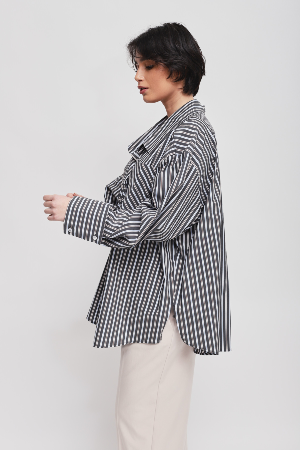 A modern, oversized shirt, ideal for those who love a sophisticated yet relaxed style that won''t go unnoticed. The thin stripes and diagonal patch pocket create a visual dynamism that will update your classic office wardrobe with originality.