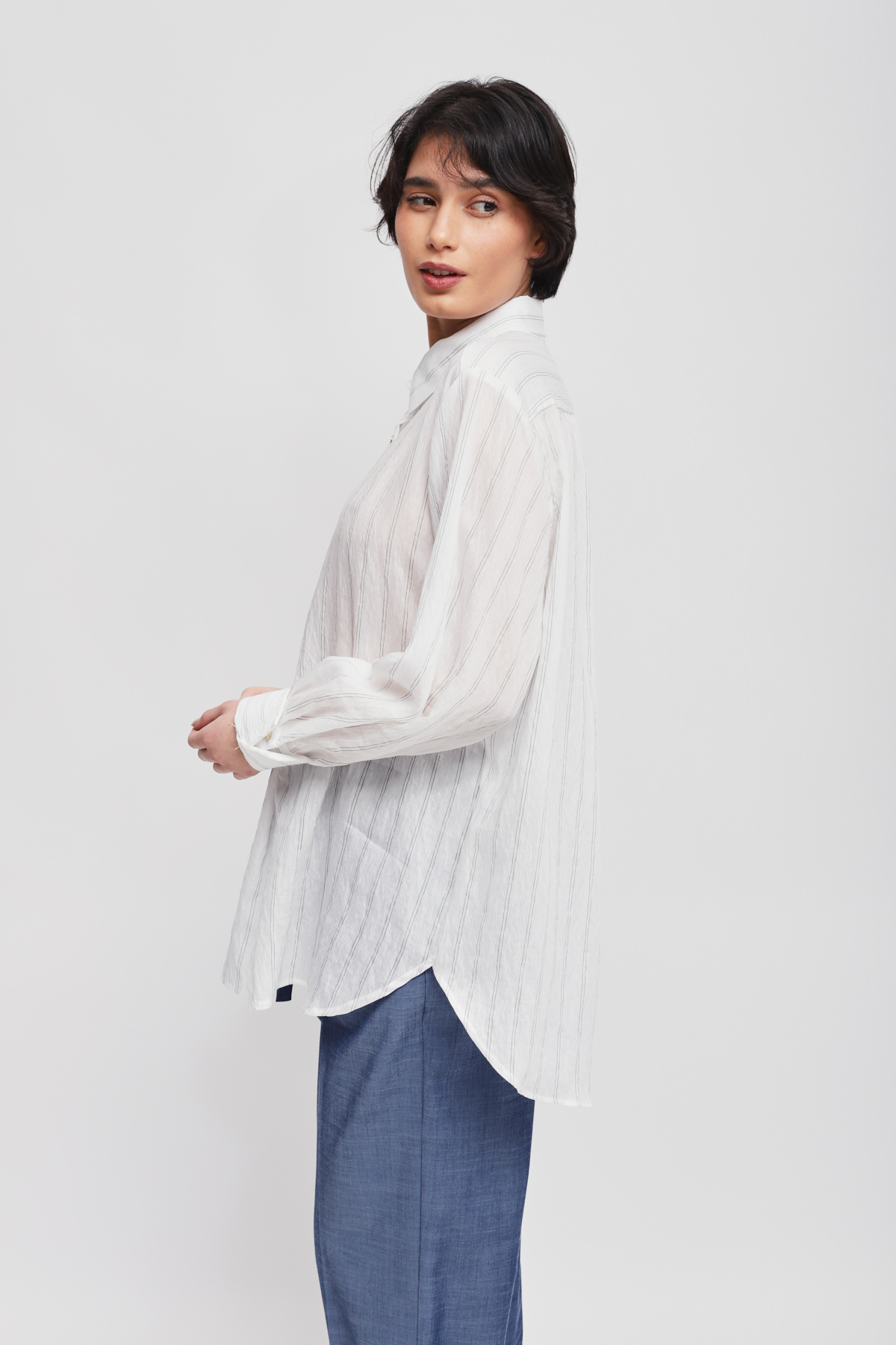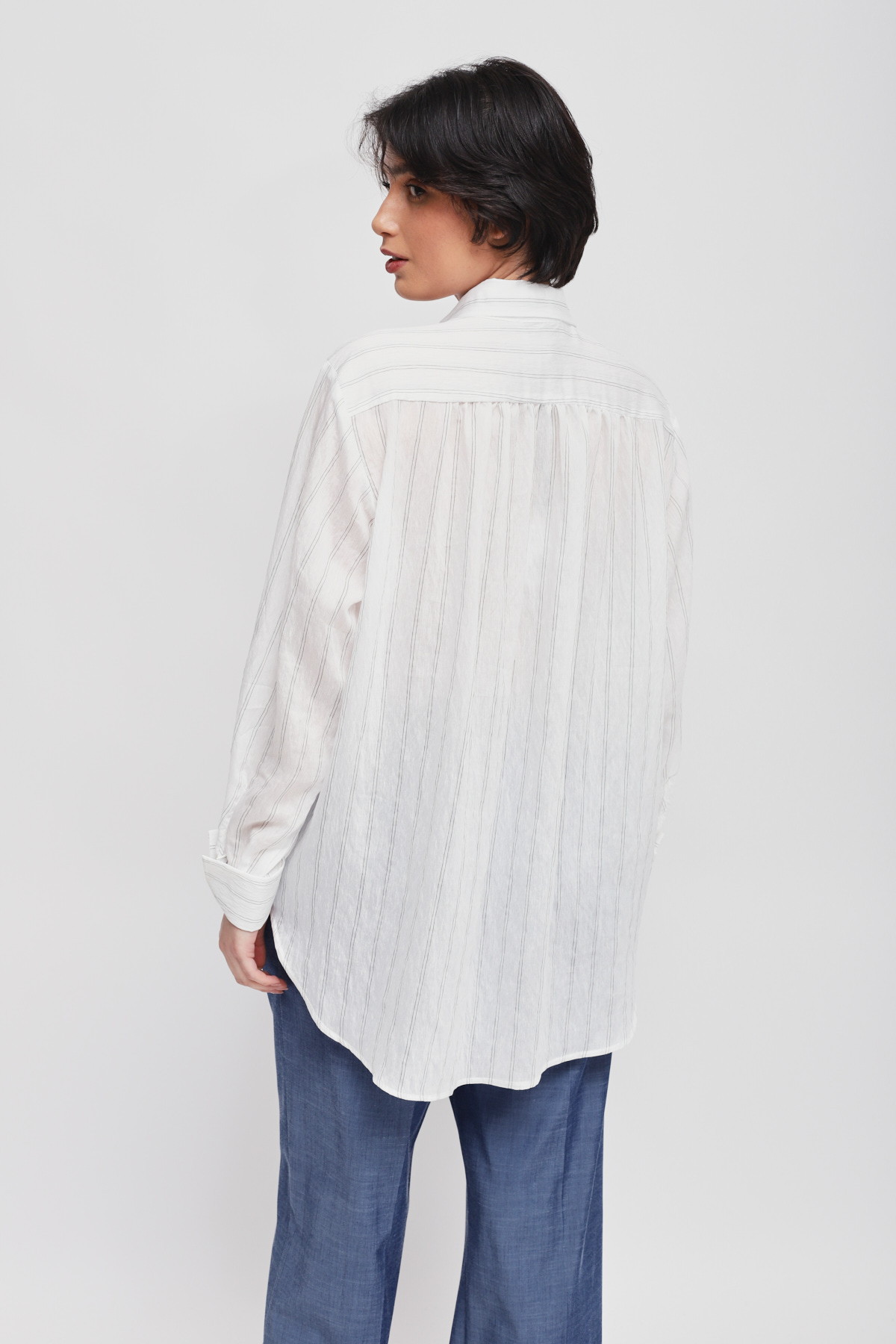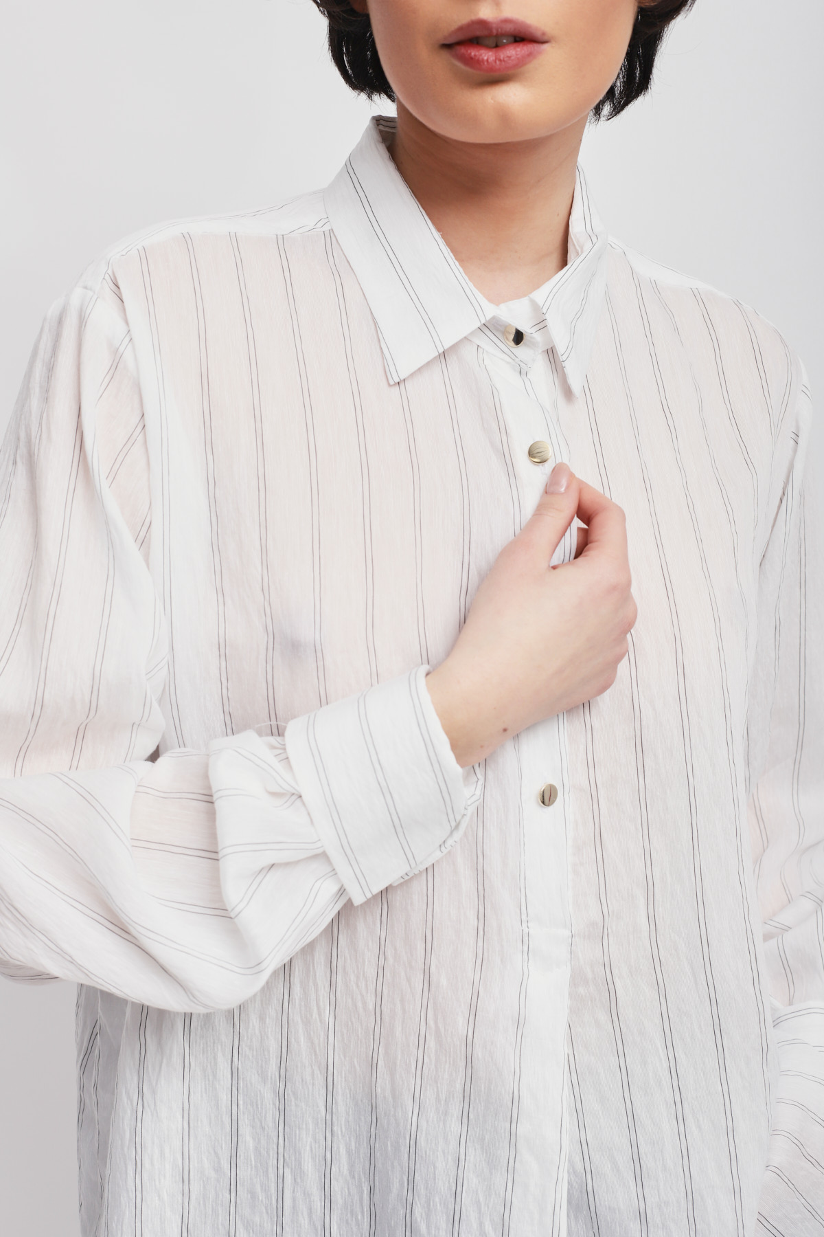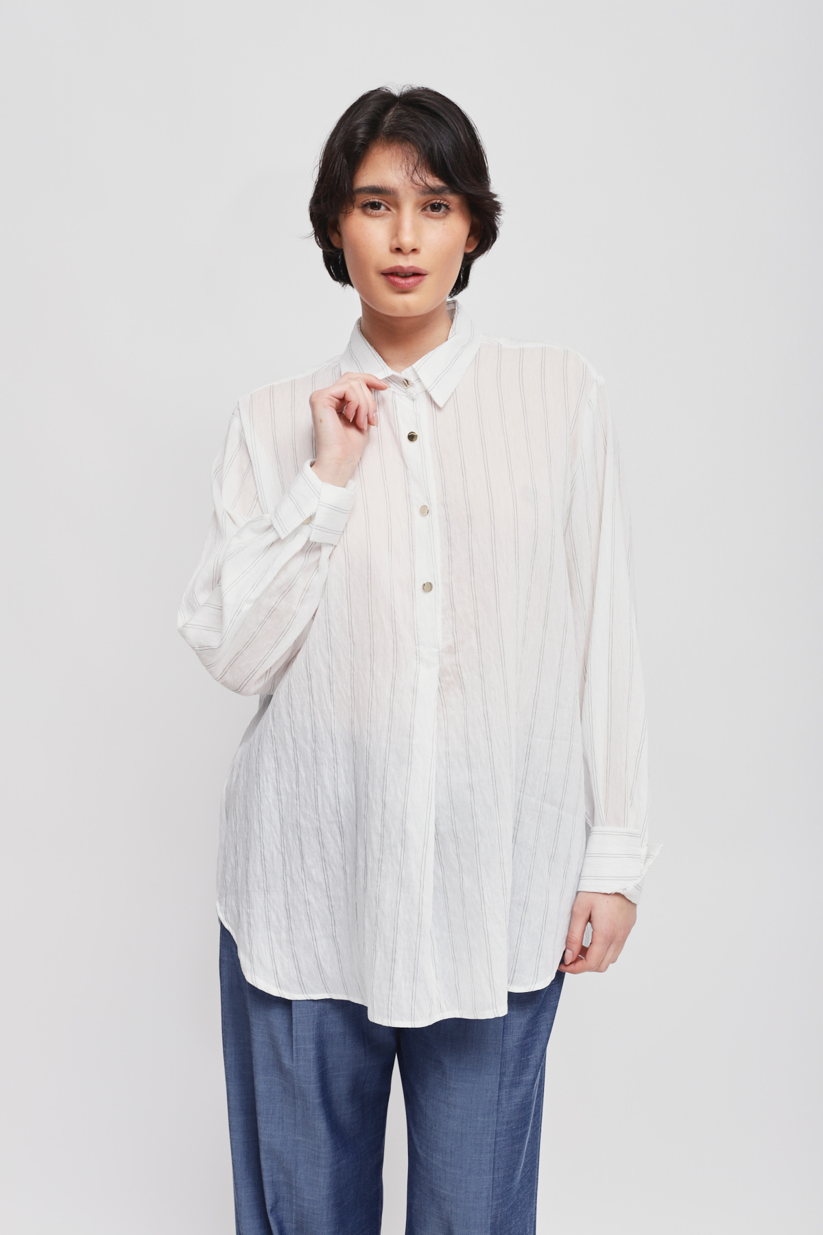 Flowy blouse embellished with a delicate thin stripe pattern, perfect for those seeking a versatile and chic piece. The clean design with a classic collar and button closure ensures a comfortable fit, ideal for both the office and leisure.