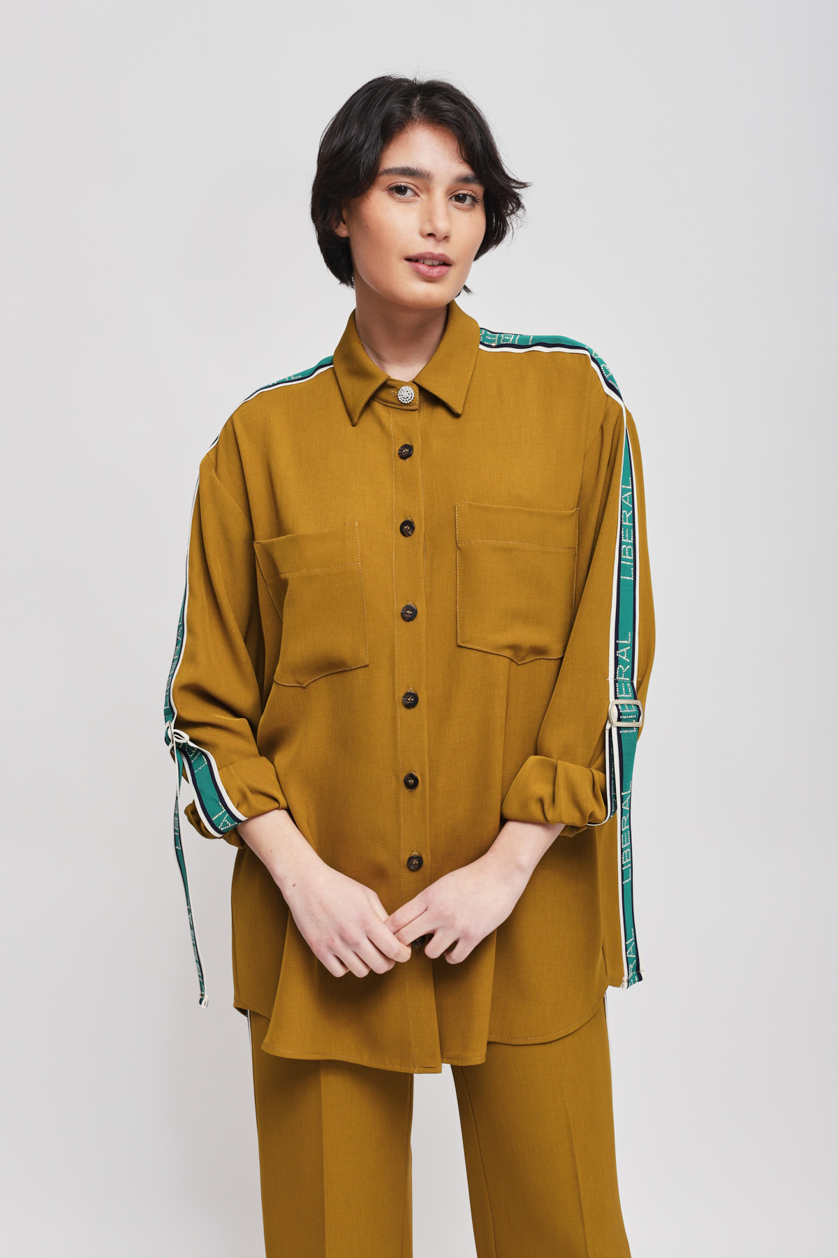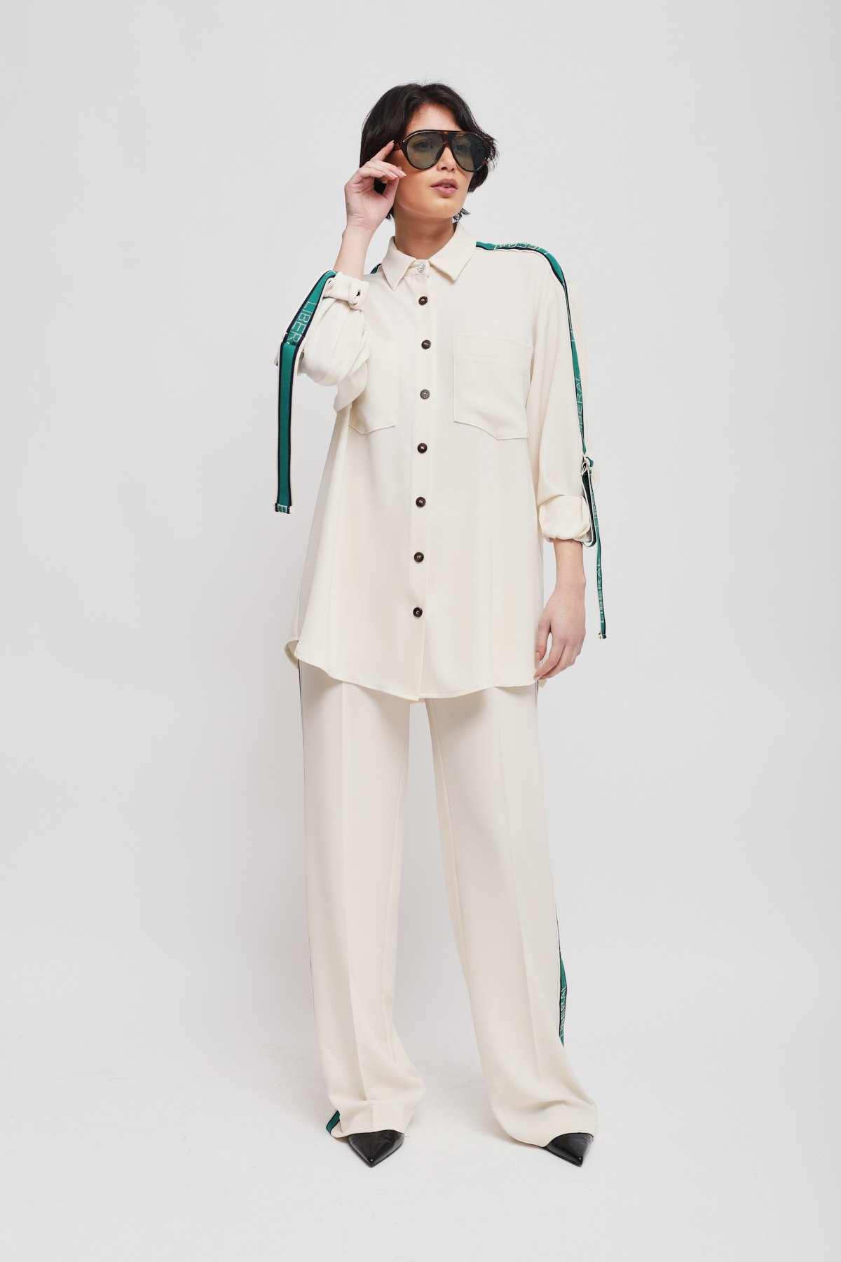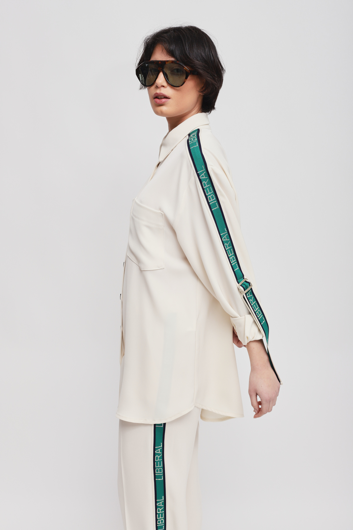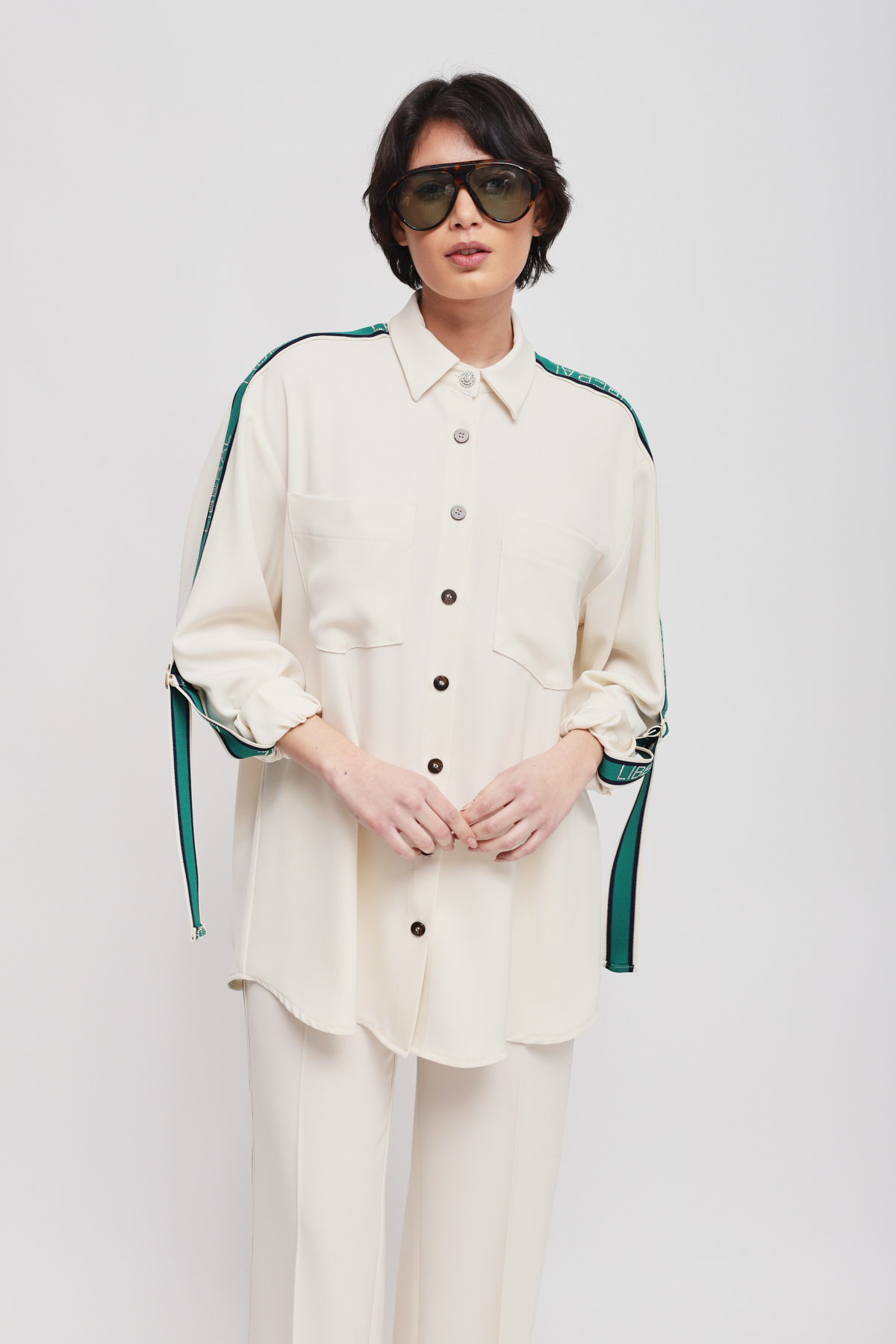 Flowy shirt enriched with side bands along the sleeves, which infuse a sporty-chic allure into a timelessly elegant piece. The front pockets and relaxed fit ensure an impeccable fit, making it the key piece for a sophisticated yet dynamic outfit.