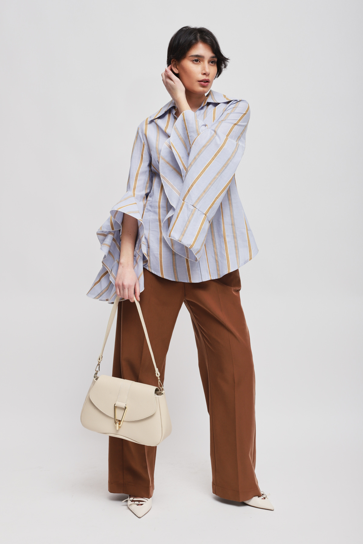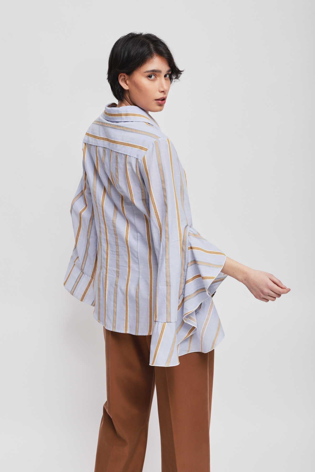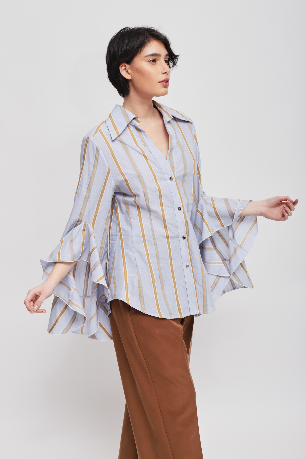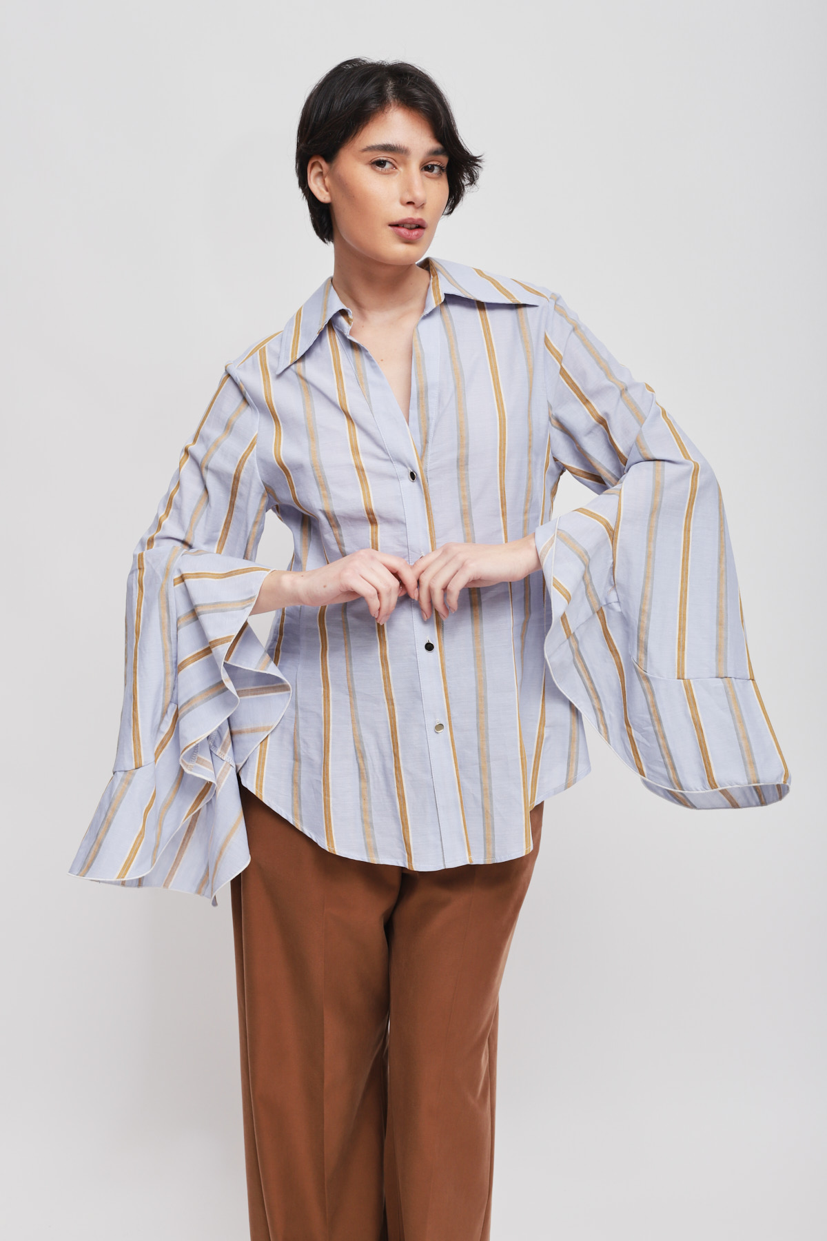 Striped shirt featuring ruffled bell sleeves, perfect for adding movement and volume to your look. The point collar and classic front closure balance the bold design, making this piece a chic and original option for special occasions or the office.