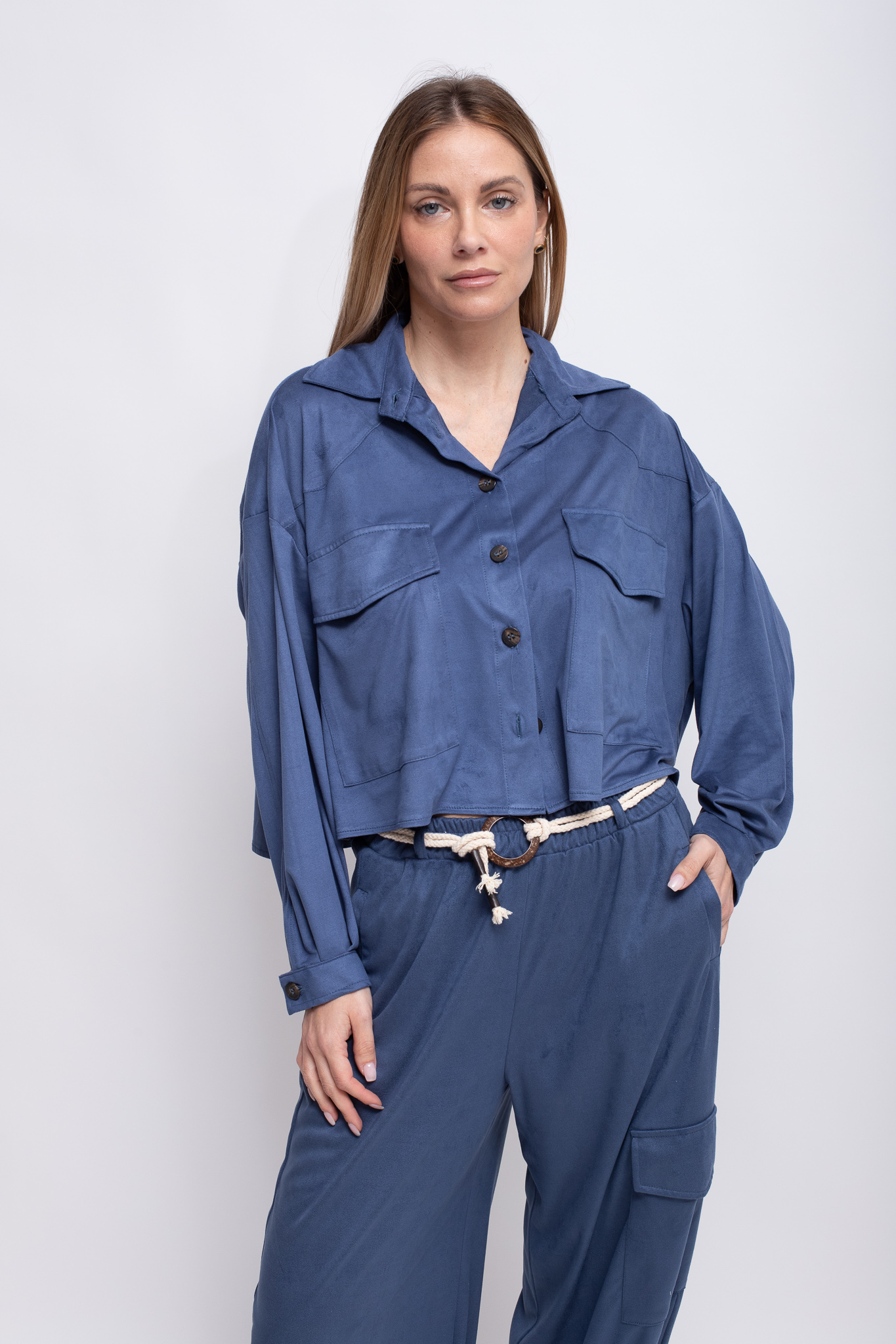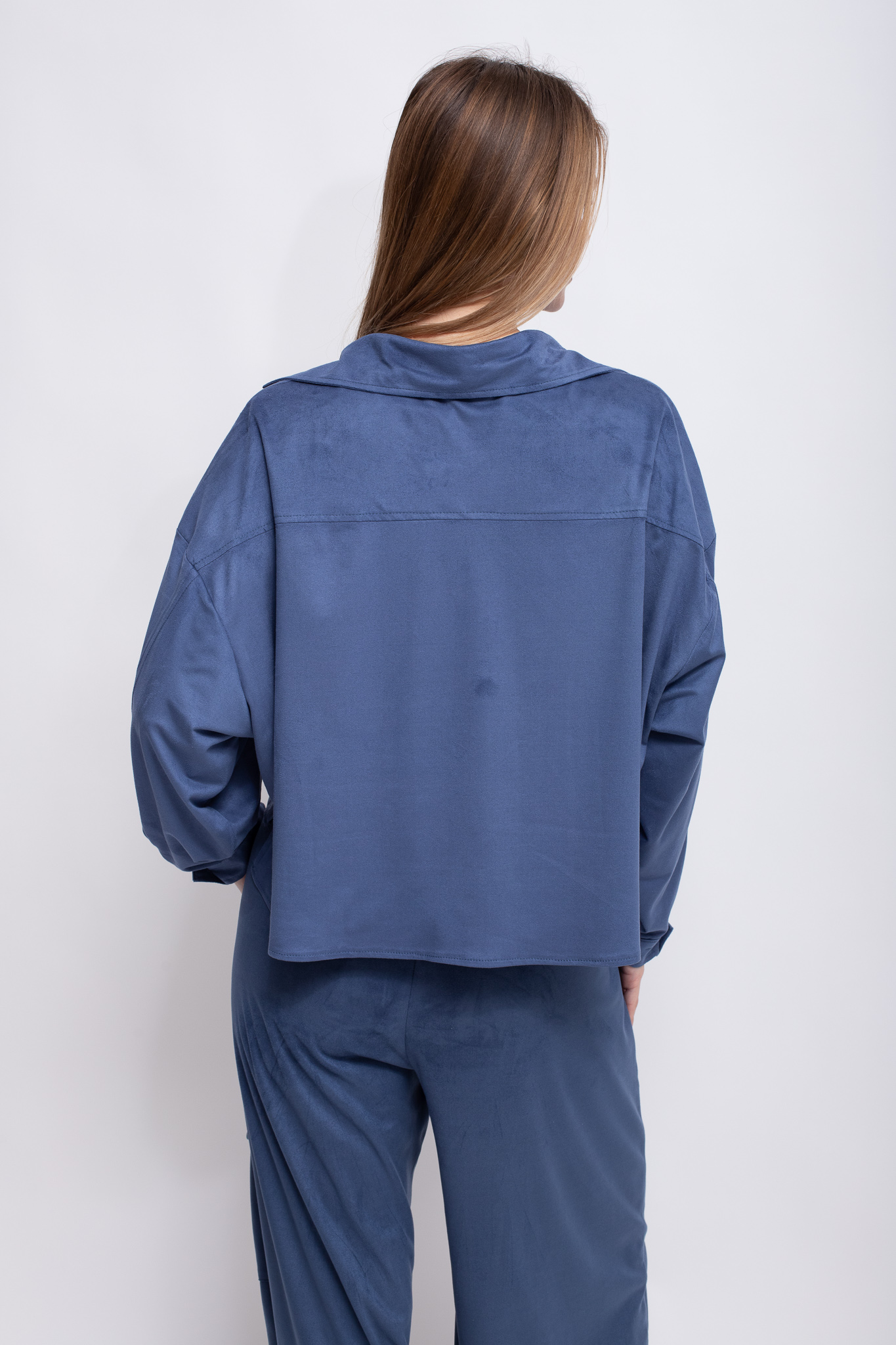 Suede shirt with a cropped fit and relaxed fit and dropped shoulders.