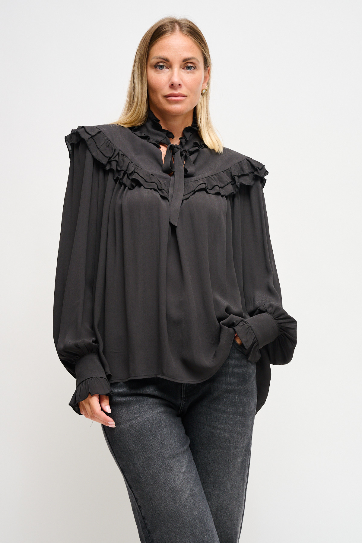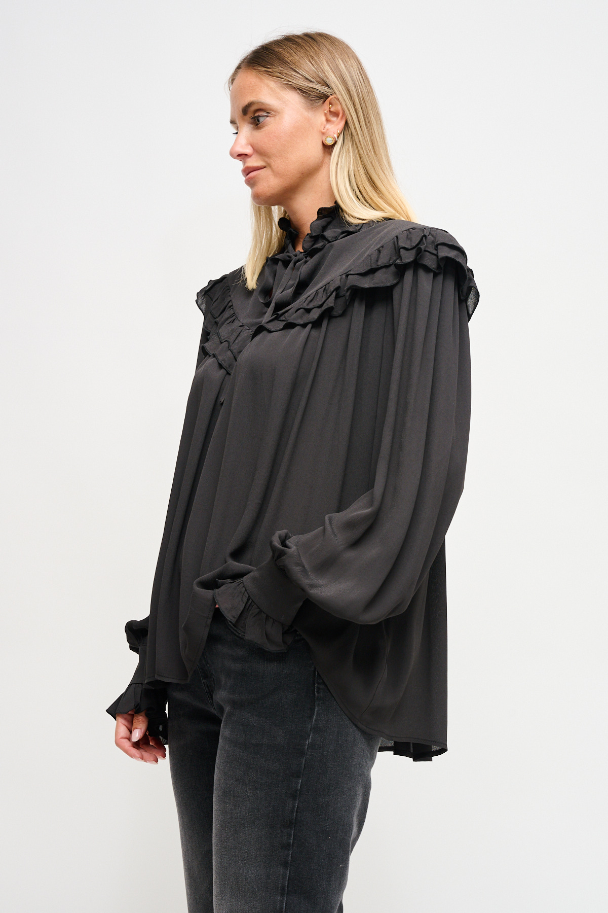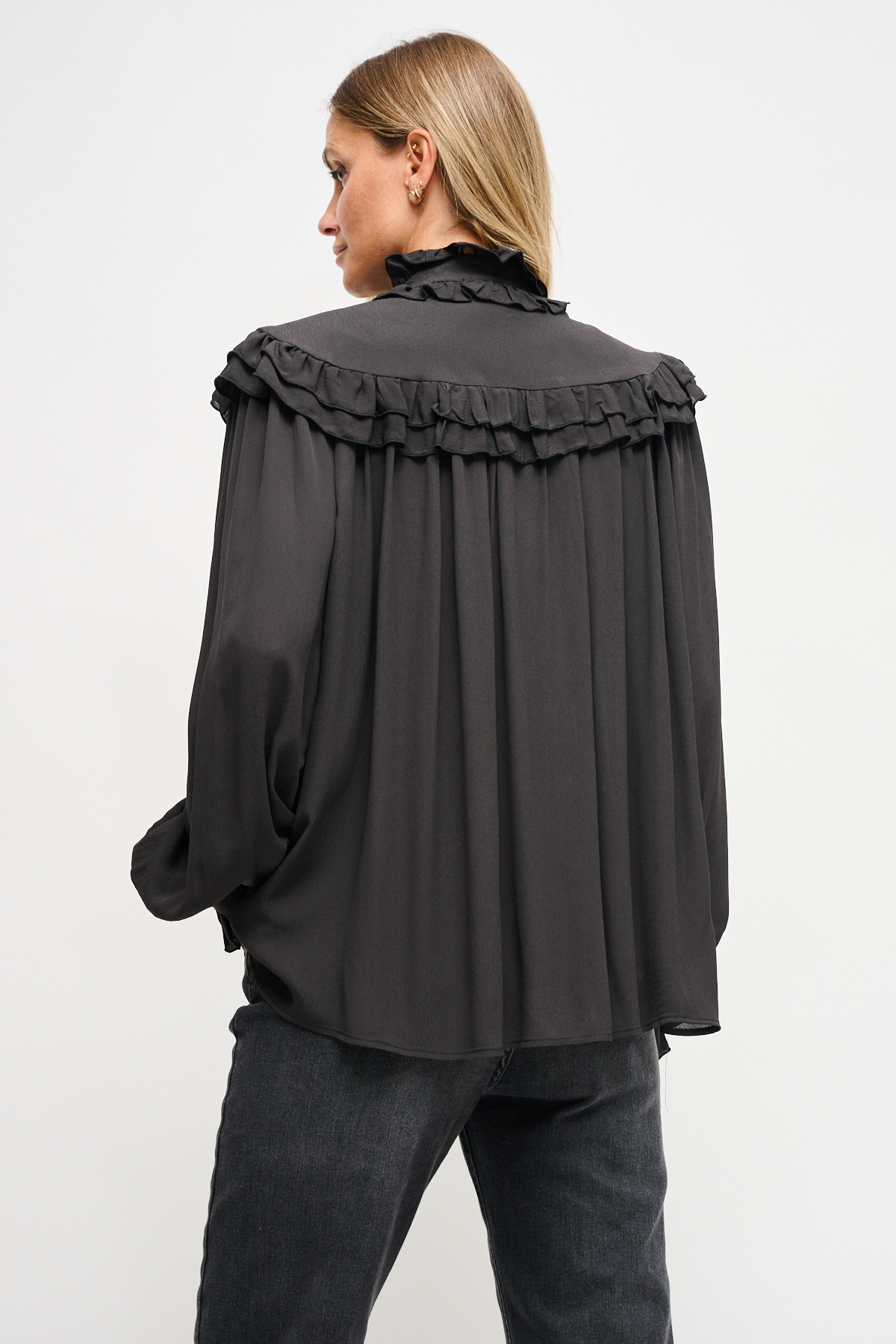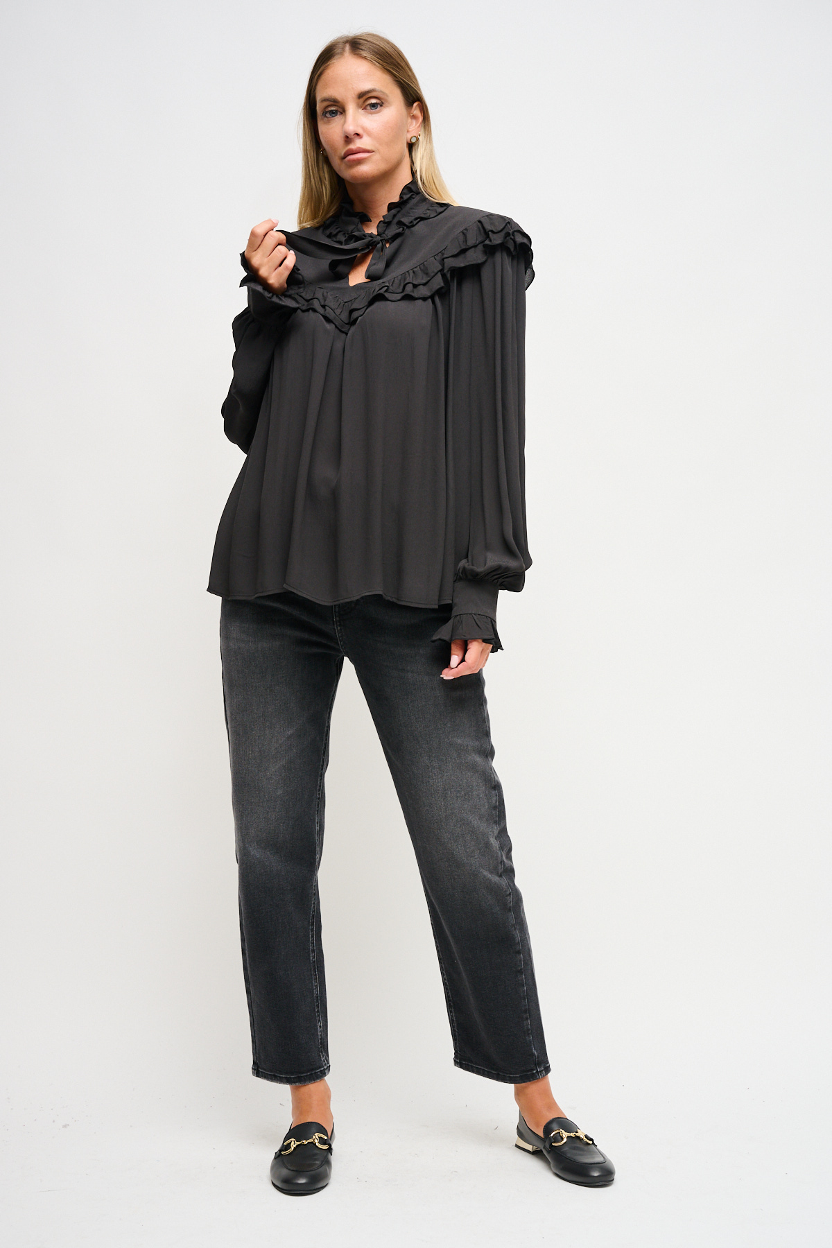 Flowy long-sleeved shirt with a high collar featuring voluminous ruffles and a front tie. The puffed sleeves with gathered cuffs enhance the sophisticated design. Perfect for a chic business look or an elegant evening outfit.