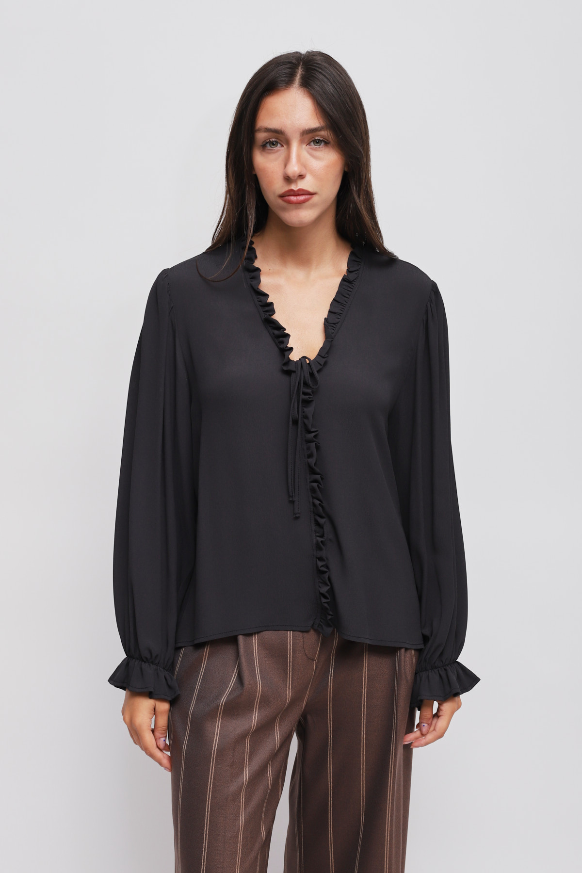 Elegant blouse in flowing fabric with a V-neck embellished with ruffles. The relaxed fit and flowing silhouette make it the essential piece for a sophisticated style.
