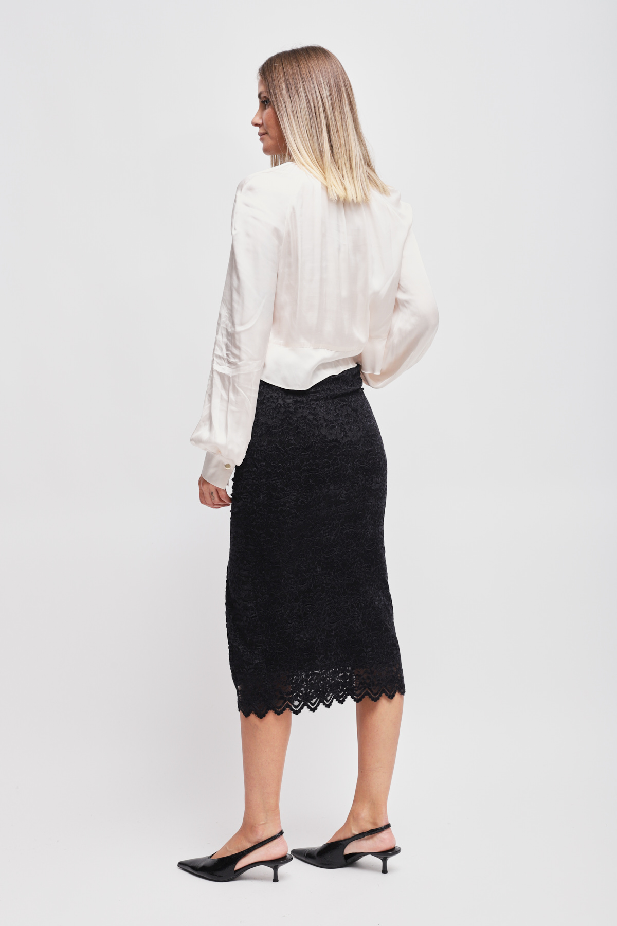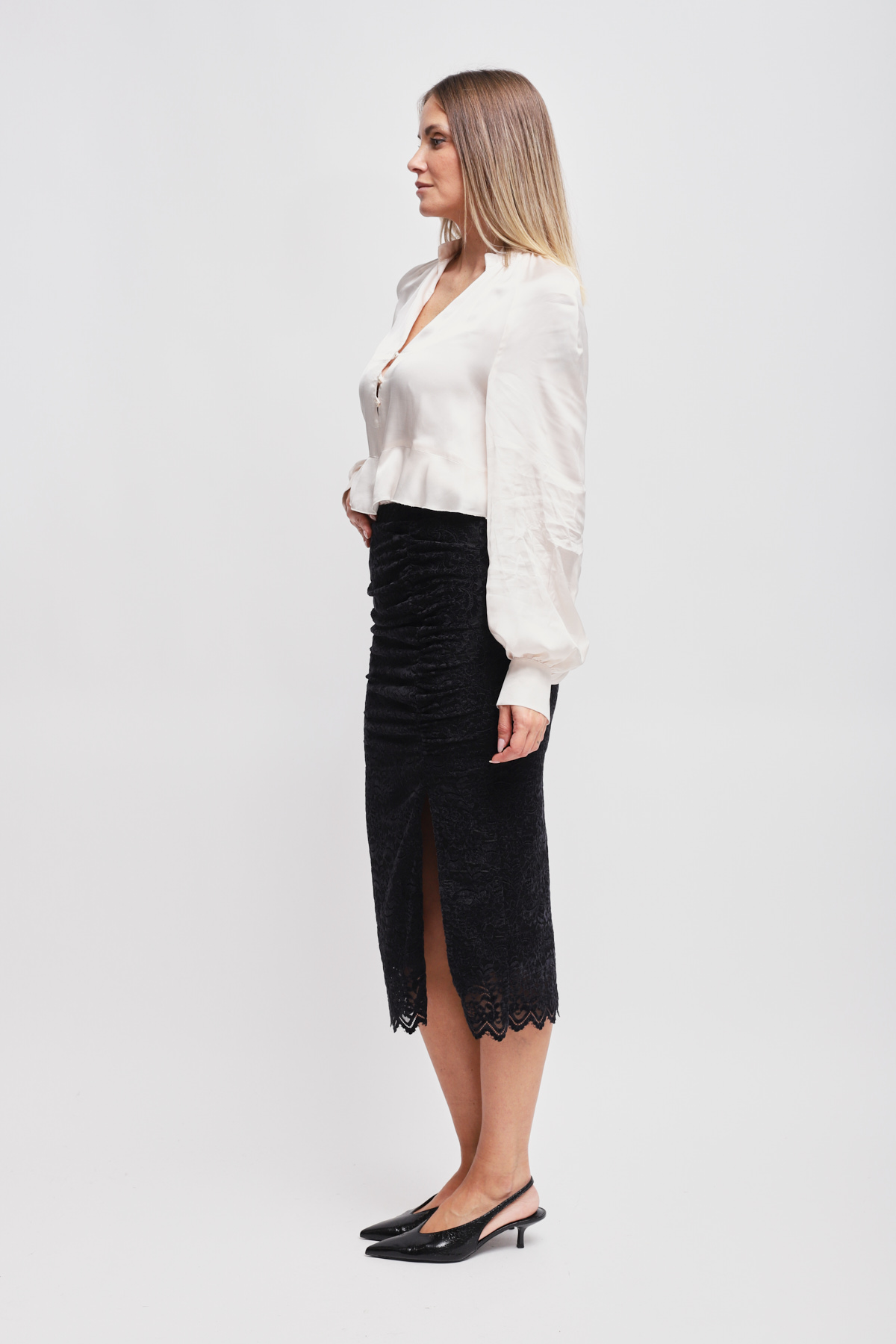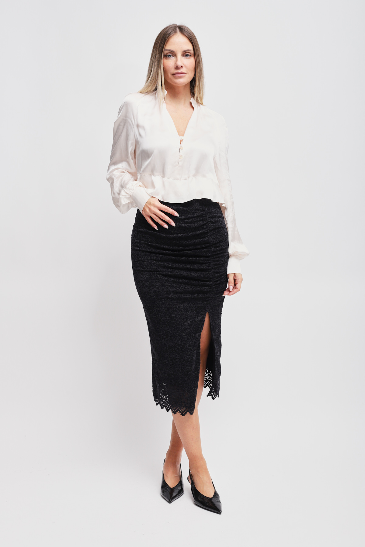 HOME > CLOTHING > SKIRTS > GONNA IN PIZZO CON DRAPPEGGIO E SPACCO
