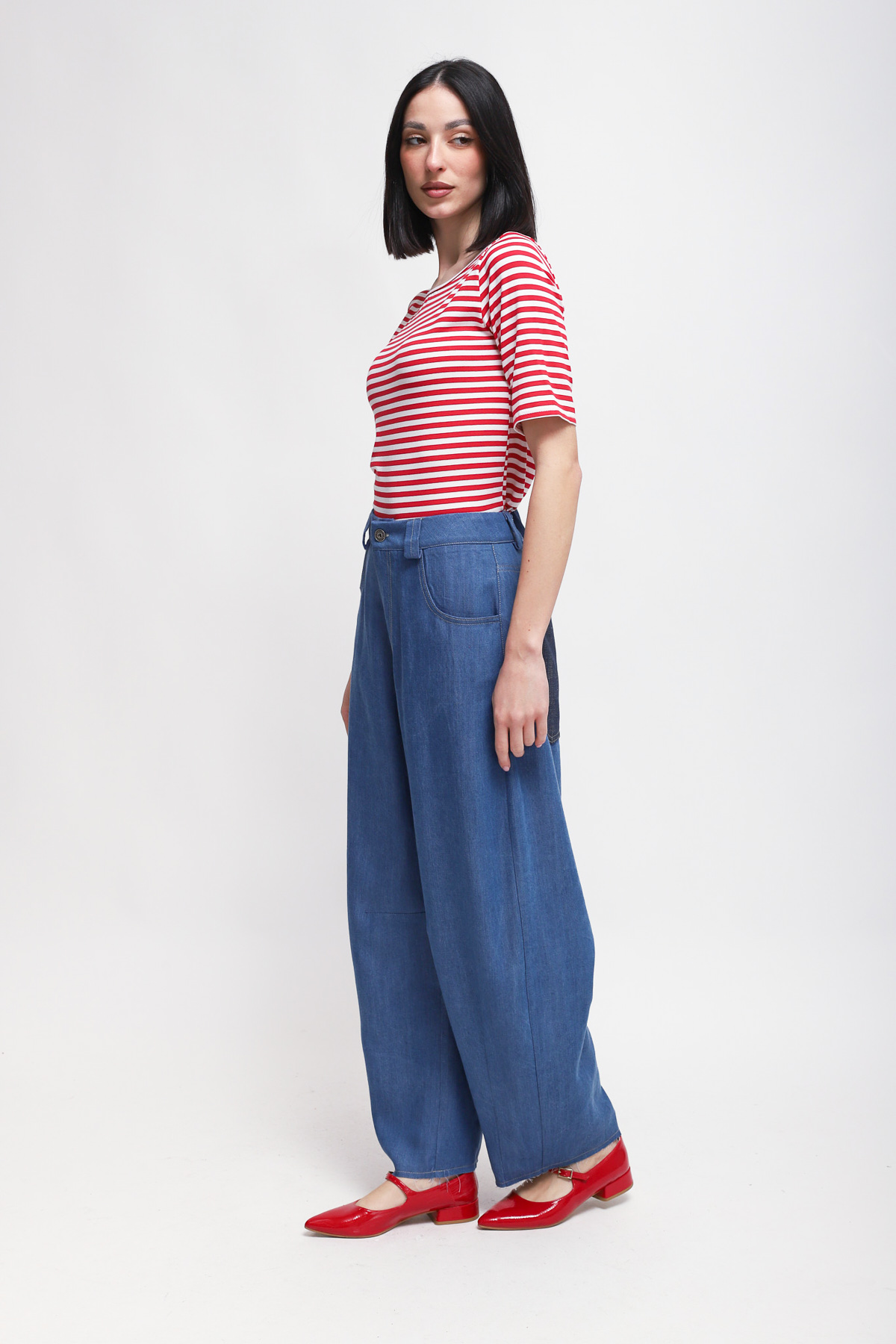 Wide-leg denim-effect trousers featuring large contrasting back pockets. Designed to be paired with the matching bomber jacket for a contemporary, urban look.