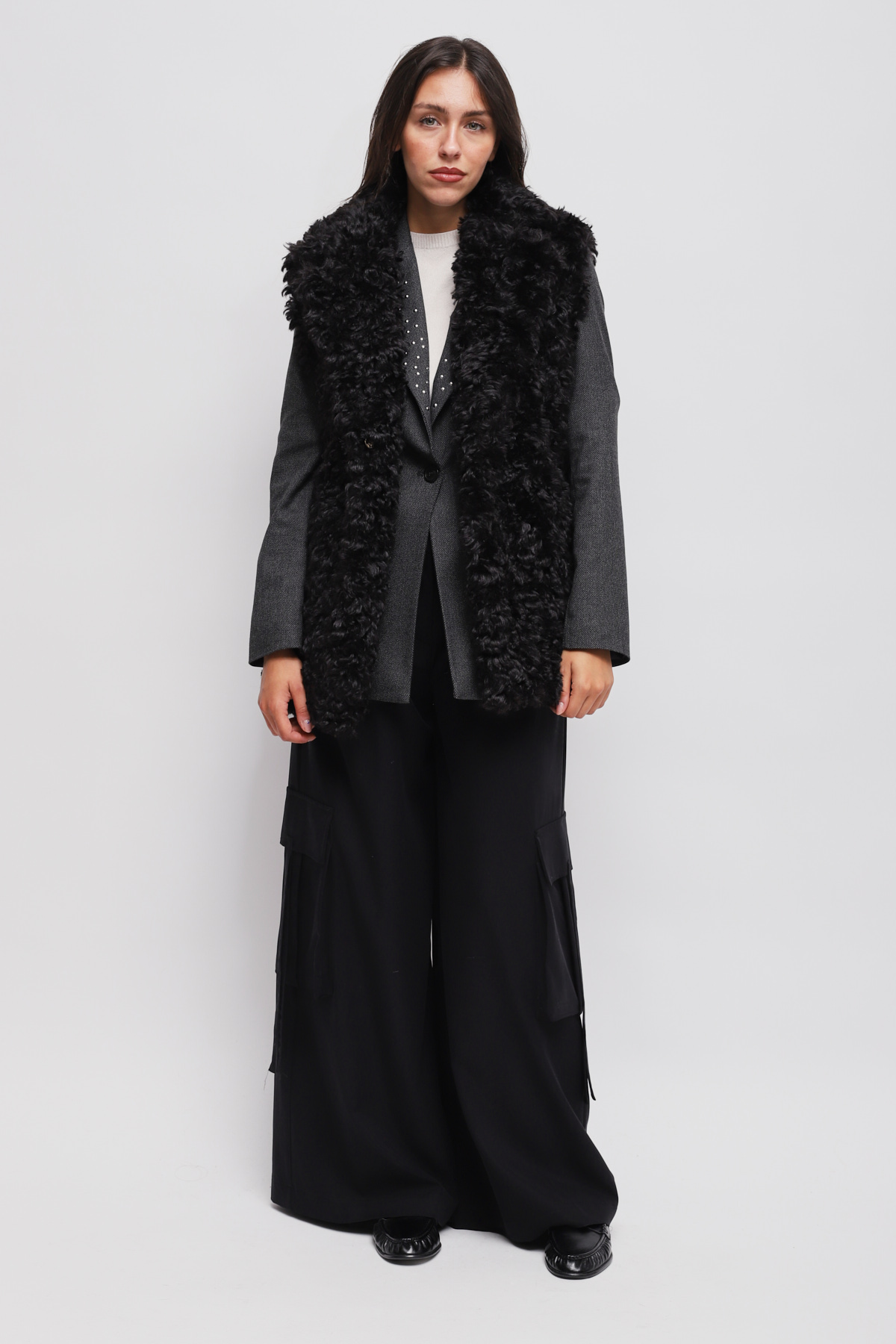 This bouclé faux fur vest adds volume and texture to any look. Designed to be worn over a jacket or sweater for a chic and trendy look.