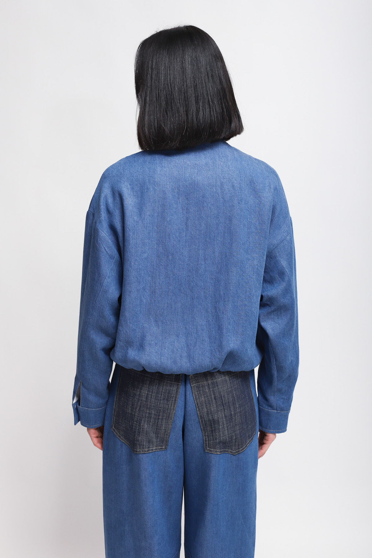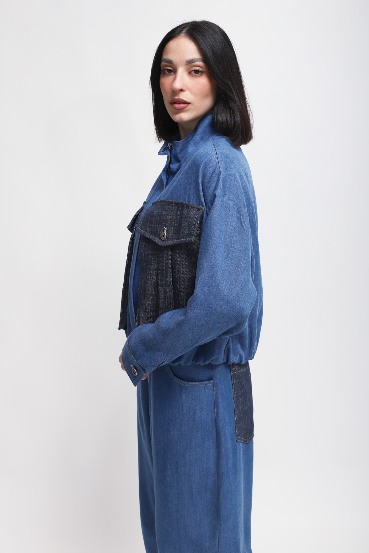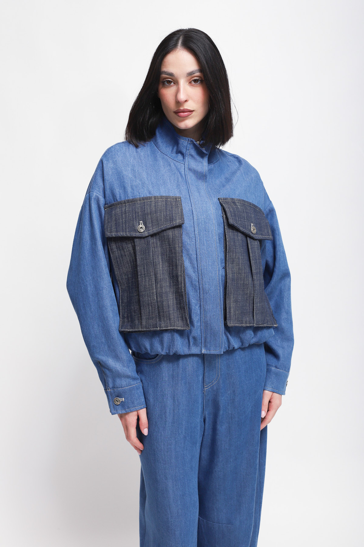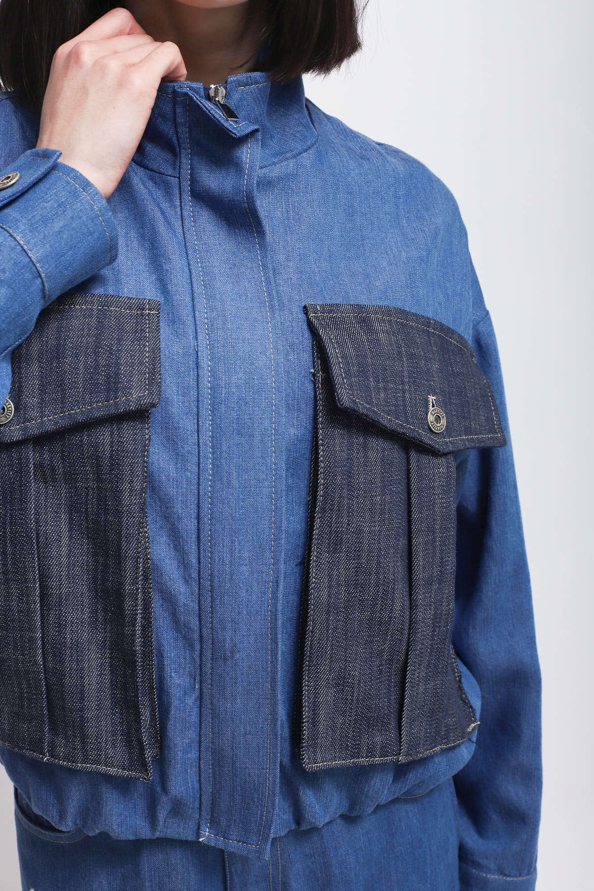 Denim-effect jacket featuring large contrasting utility pockets on the front and a high collar. The style features long sleeves with buttoned cuffs and a central zip closure.