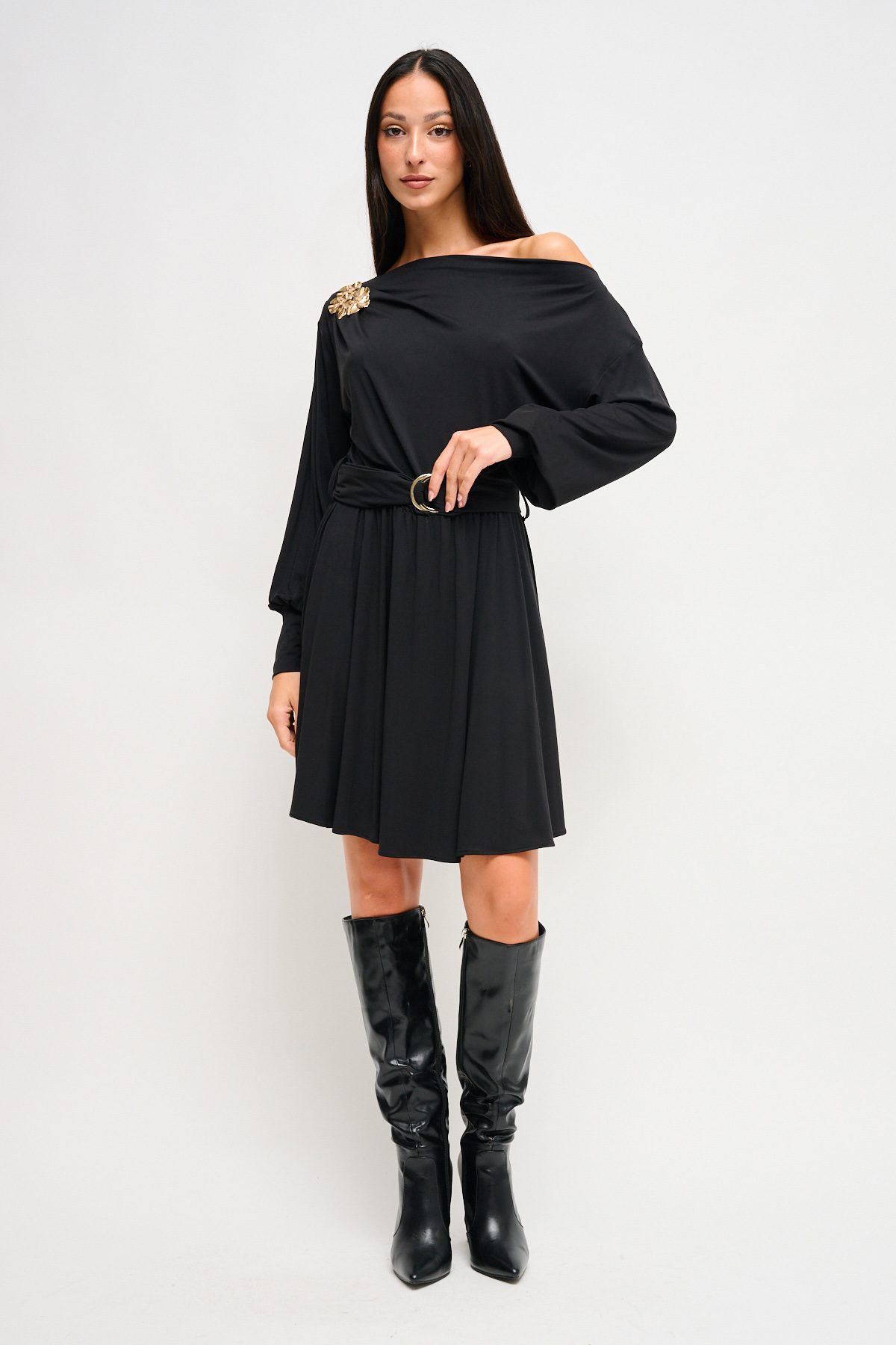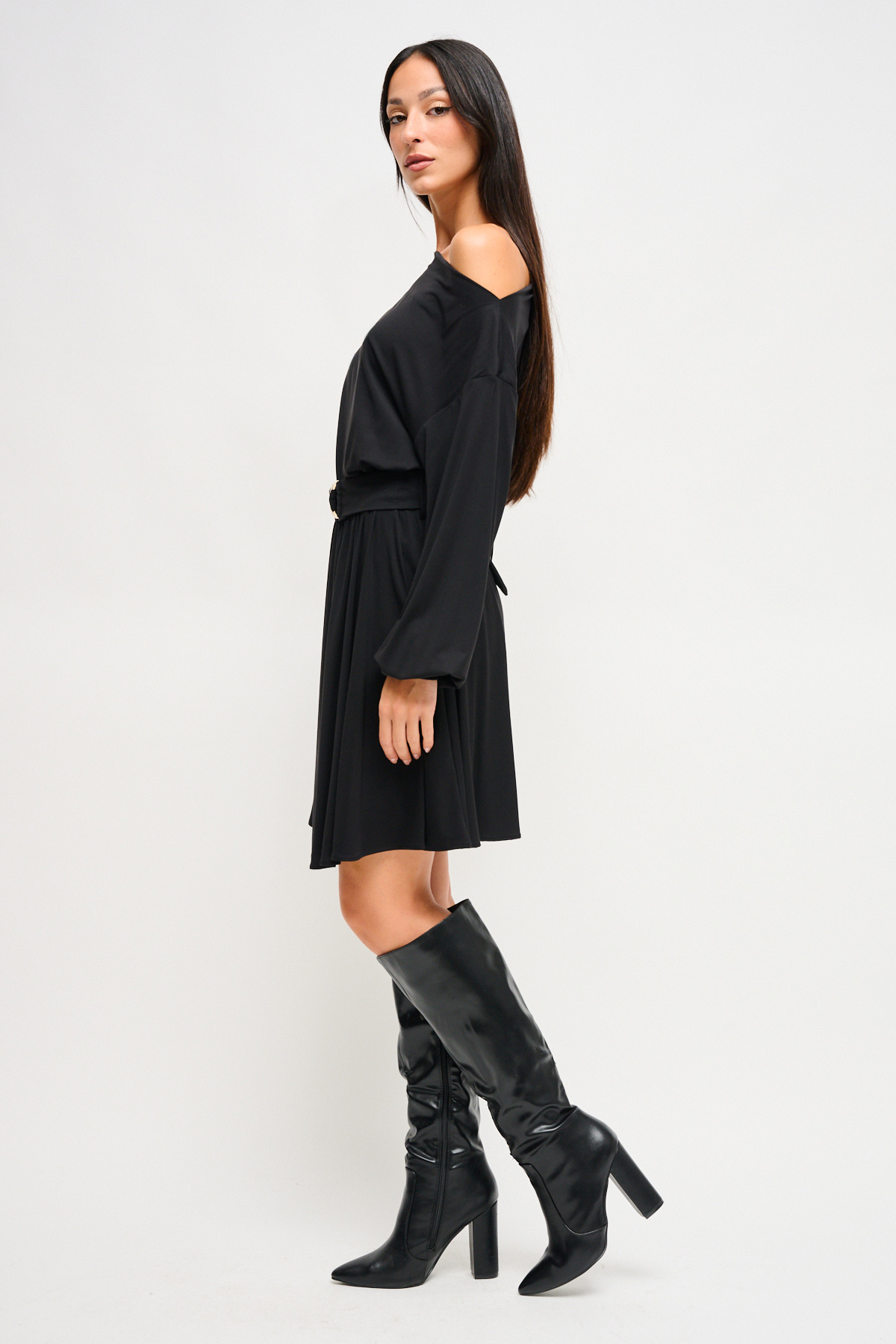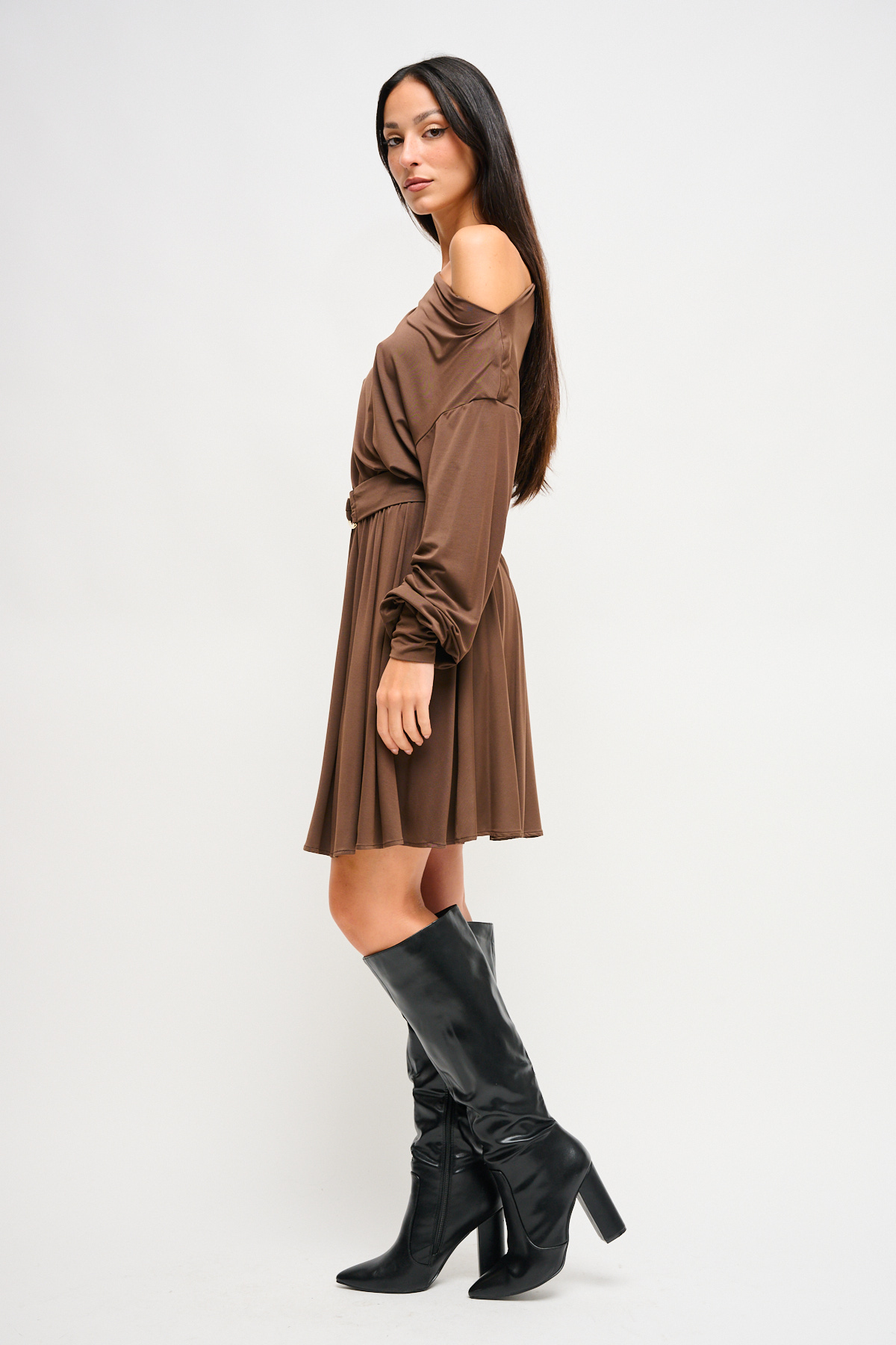 Abito versatile e casual chic, perfetto per ogni occasione. Il taglio morbido e il tessuto leggero offrono una vestibilità comoda e fluida. Lo scollo mette in risalto le spalle mentre la cintura in vita permette di esaltare la silhouette. Ideale da indossare con stivali o tacchi per un look di tendenza.