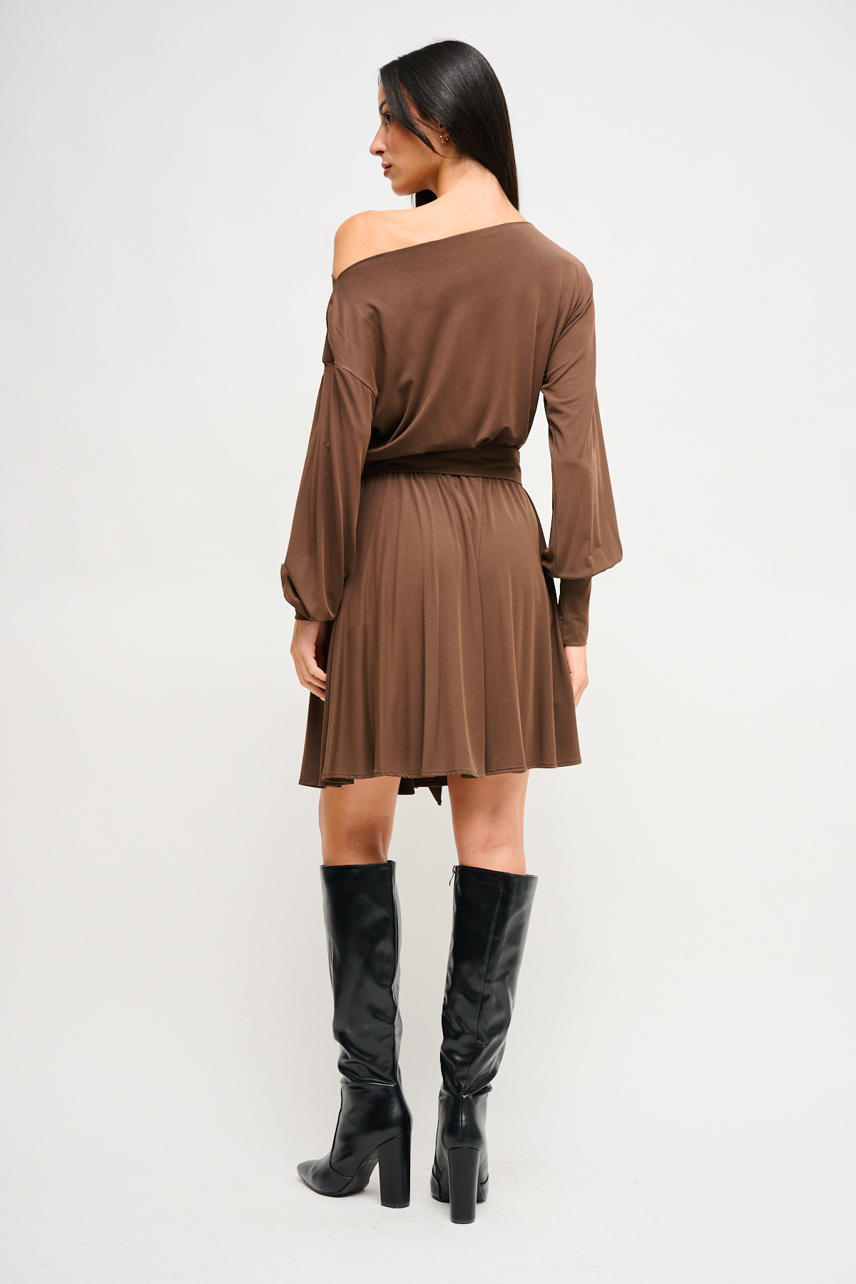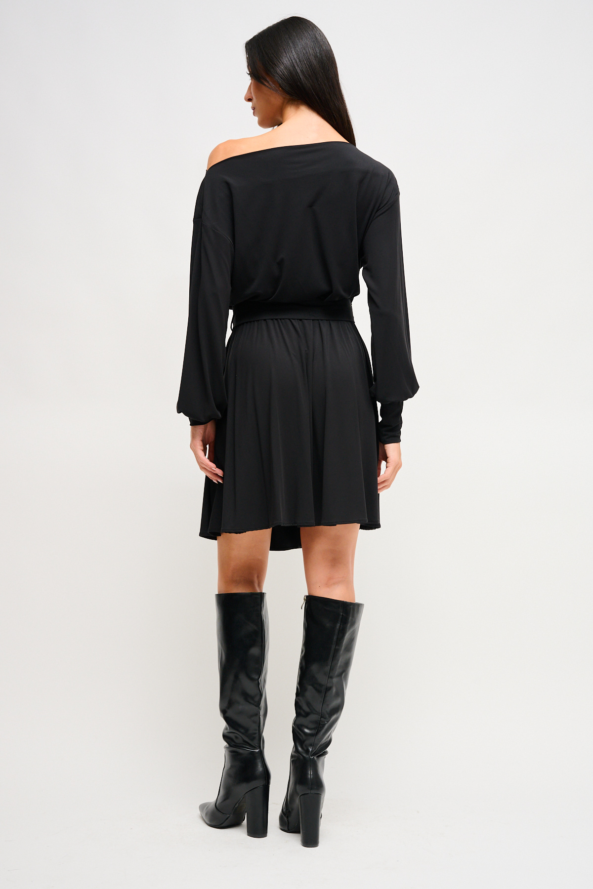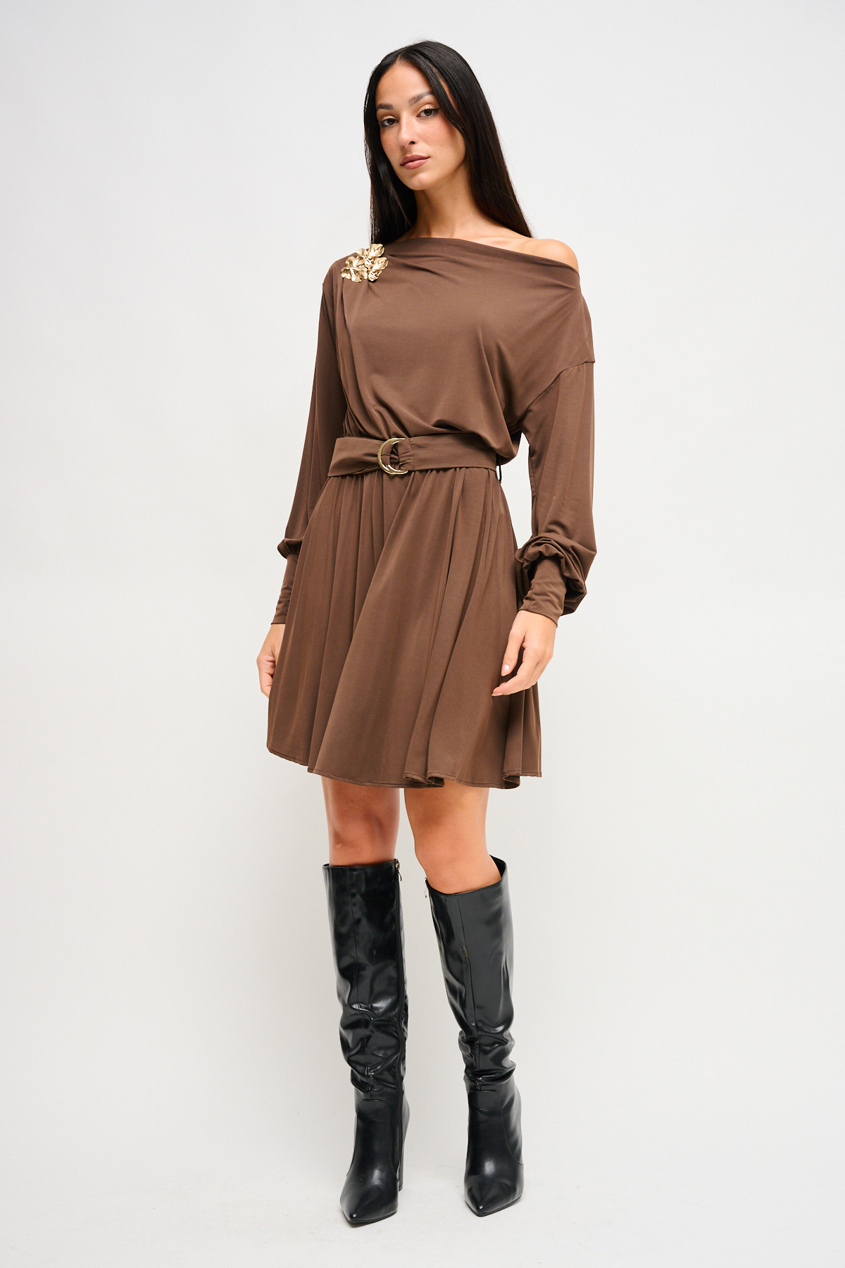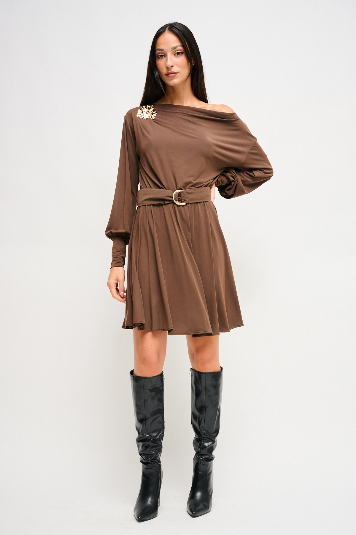 Abito versatile e casual chic, perfetto per ogni occasione. Il taglio morbido e il tessuto leggero offrono una vestibilità comoda e fluida. Lo scollo mette in risalto le spalle mentre la cintura in vita permette di esaltare la silhouette. Ideale da indossare con stivali o tacchi per un look di tendenza.