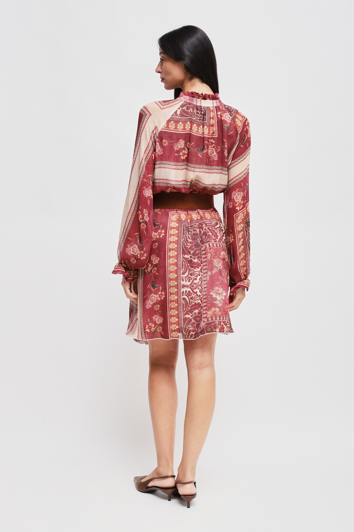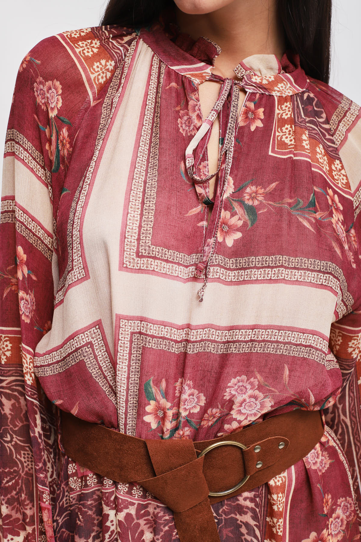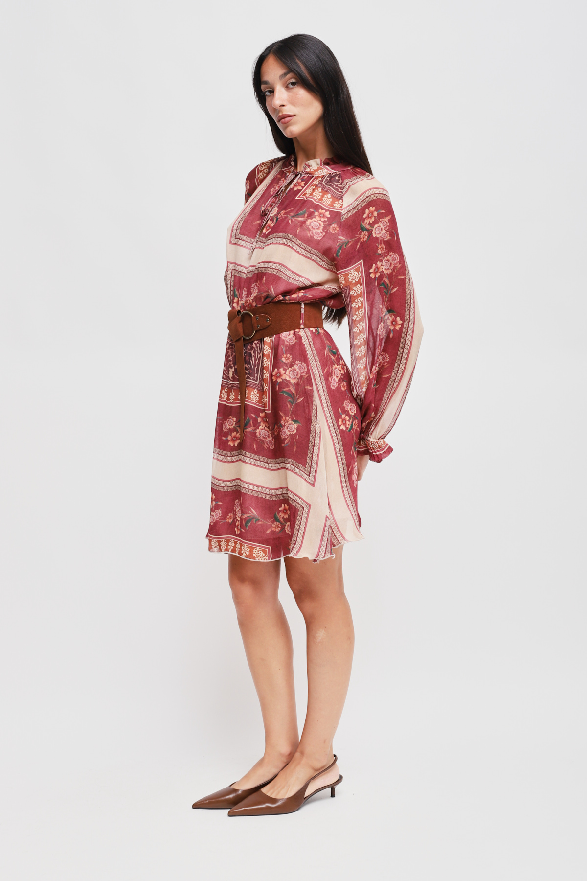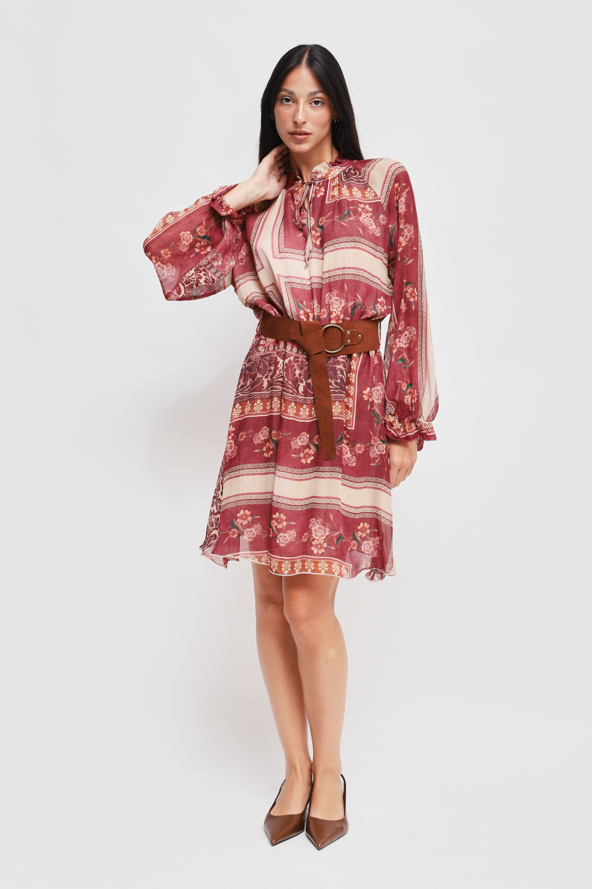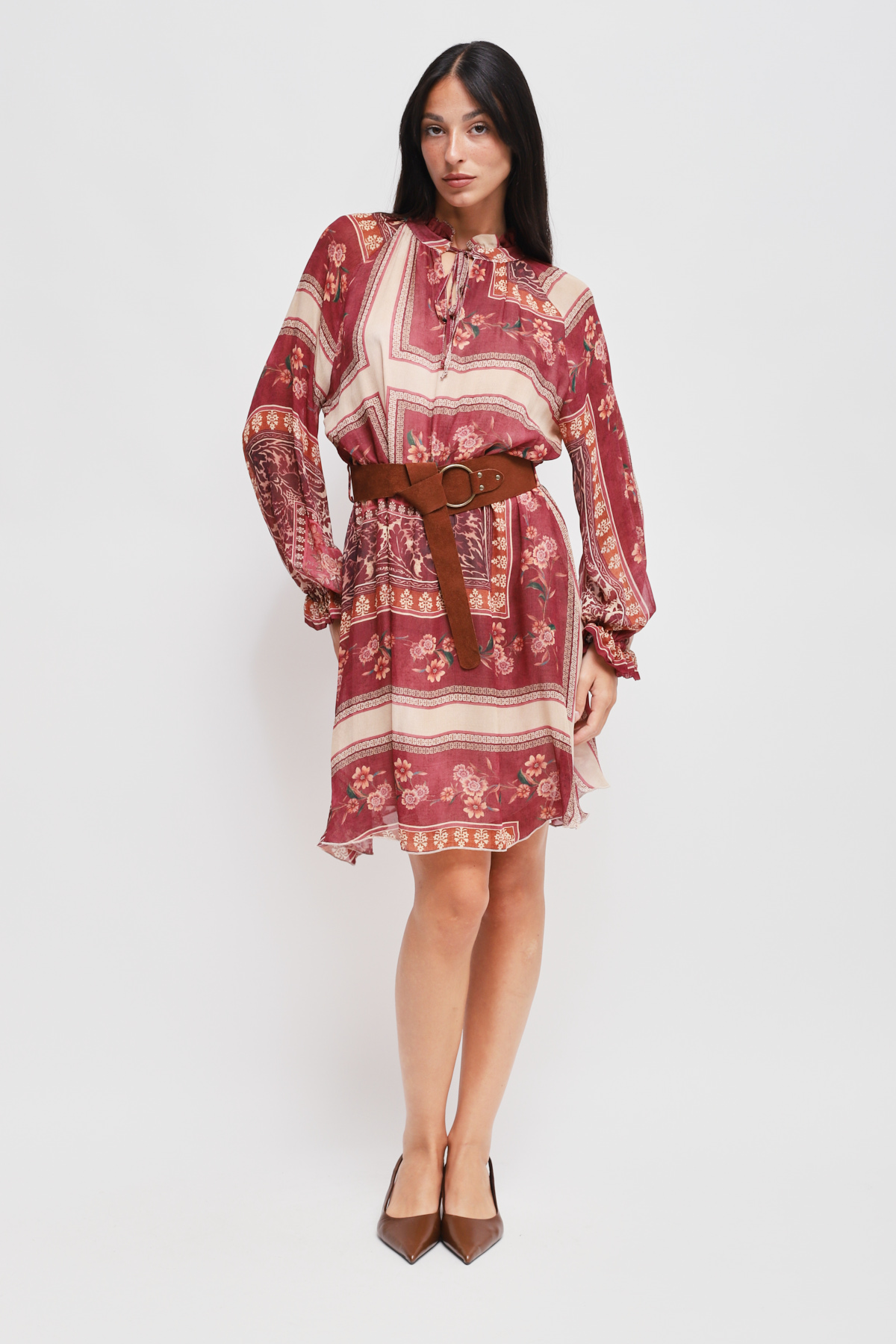 Abito corto e fluido con maniche lunghe a sbuffo e polsini elastici. Collo alto con chiusura a laccetti e cintura scamosciata in vita che definisce la silhouette e dona un tocco bohemian.