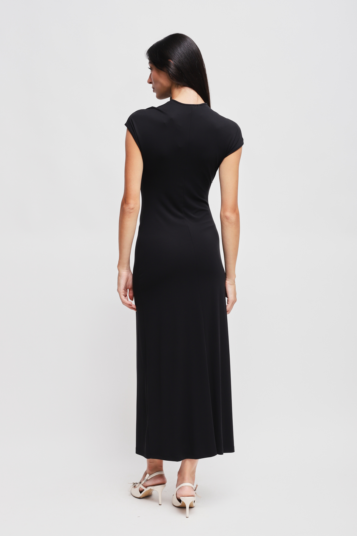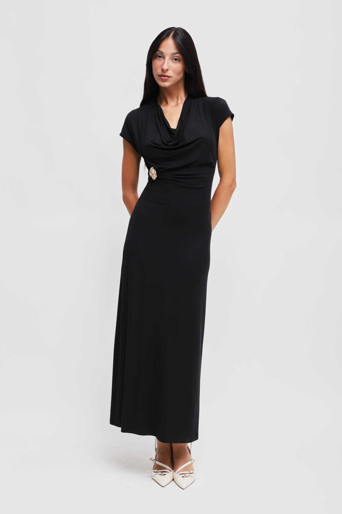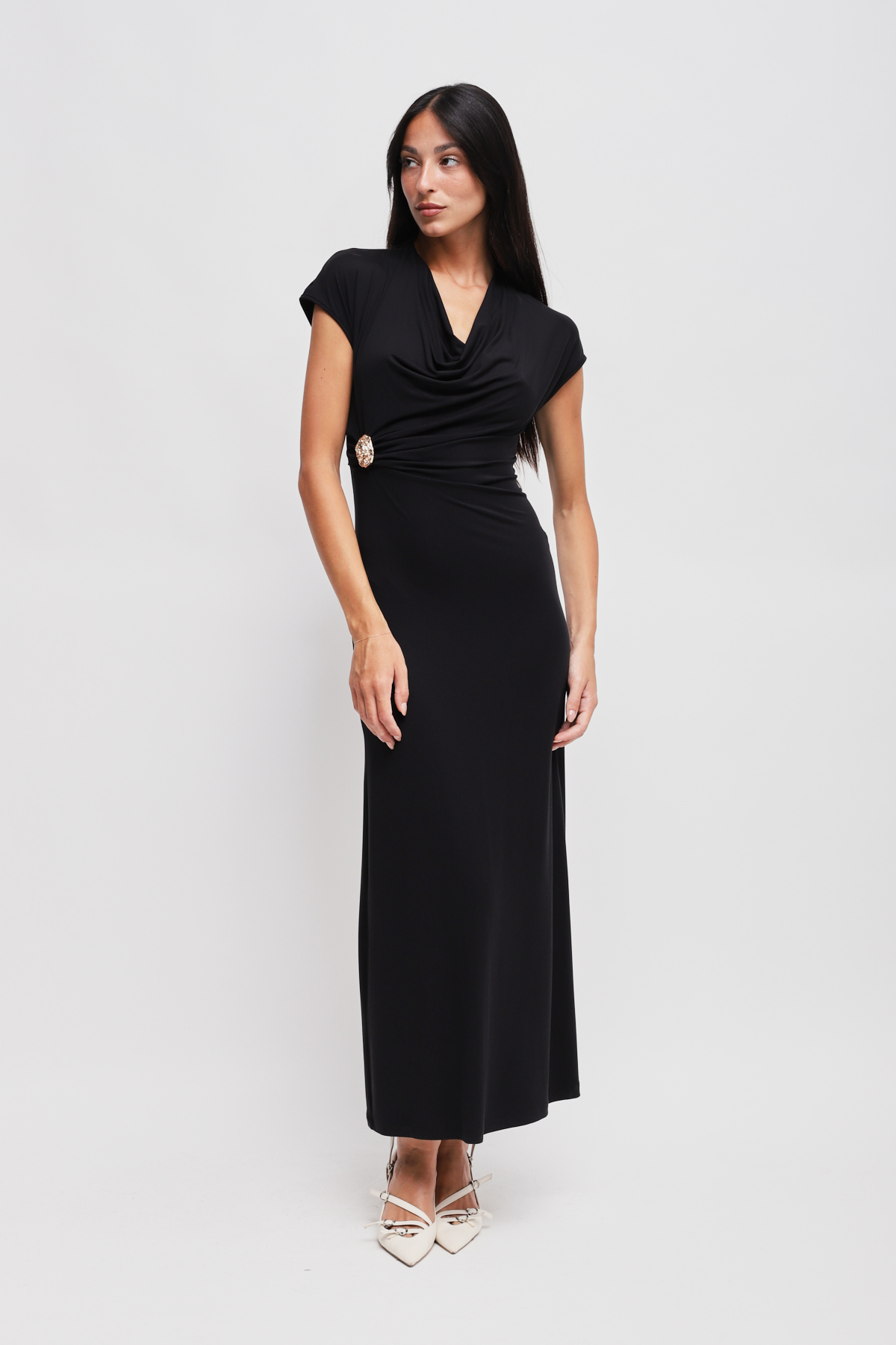 Abito lungo da cerimonia in tessuto fluido, perfetto per eventi serali. Il tubino presenta un sofisticato scollo a cascata e un punto vita drappeggiato che valorizza la silhouette. Il dettaglio gioiello laterale funge da punto focale.