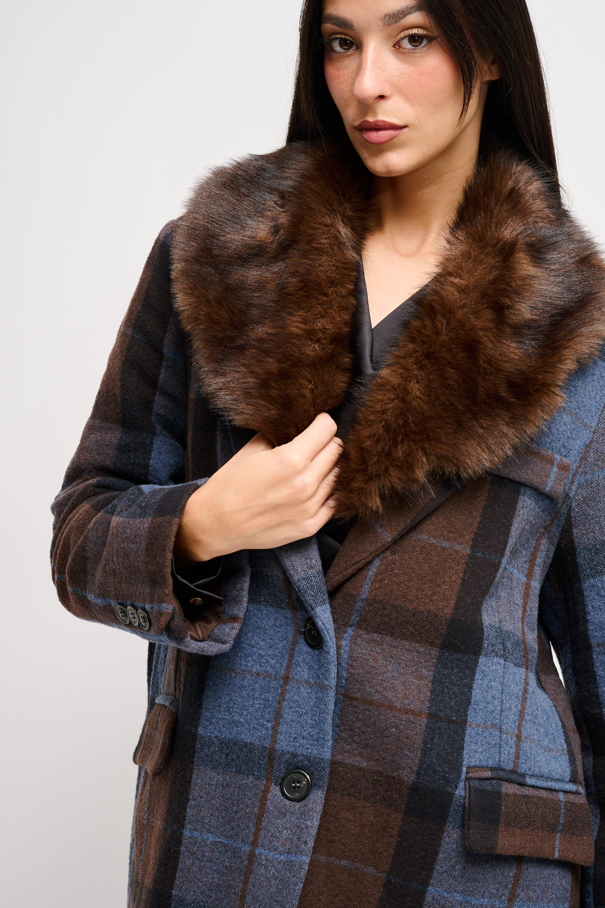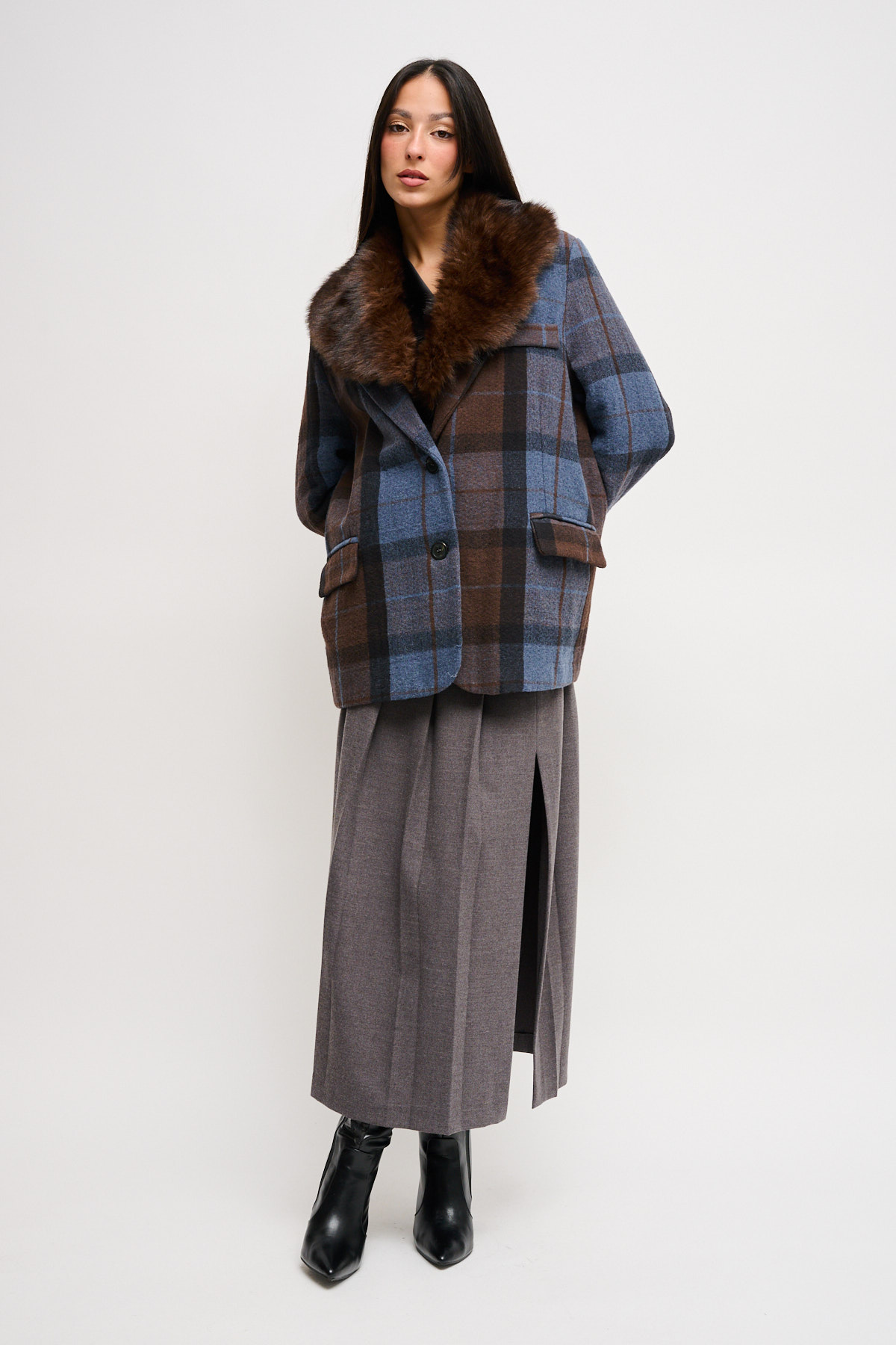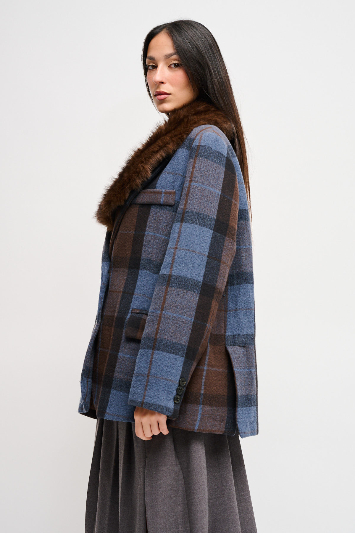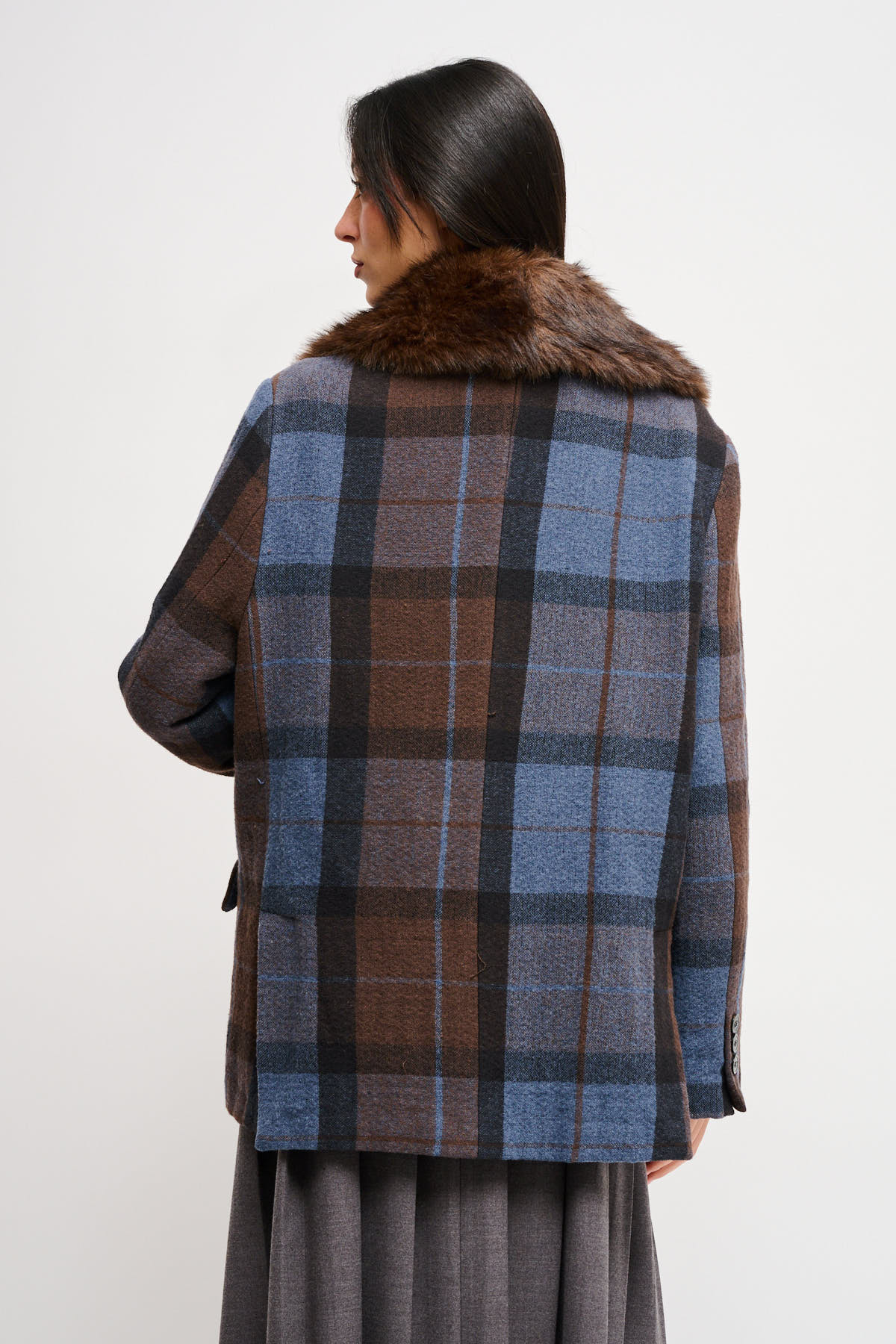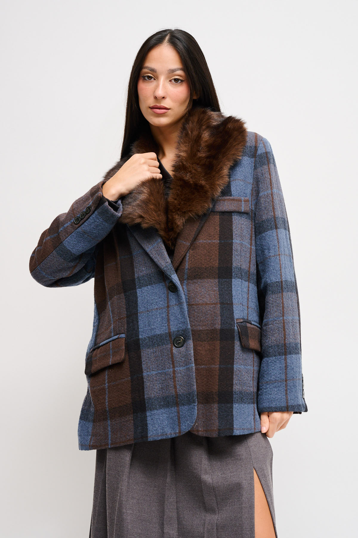 HOME > ABBIGLIAMENTO > CAPISPALLA > GIACCA CHECK OVER CON COLLO IN ECOPELLICCIA