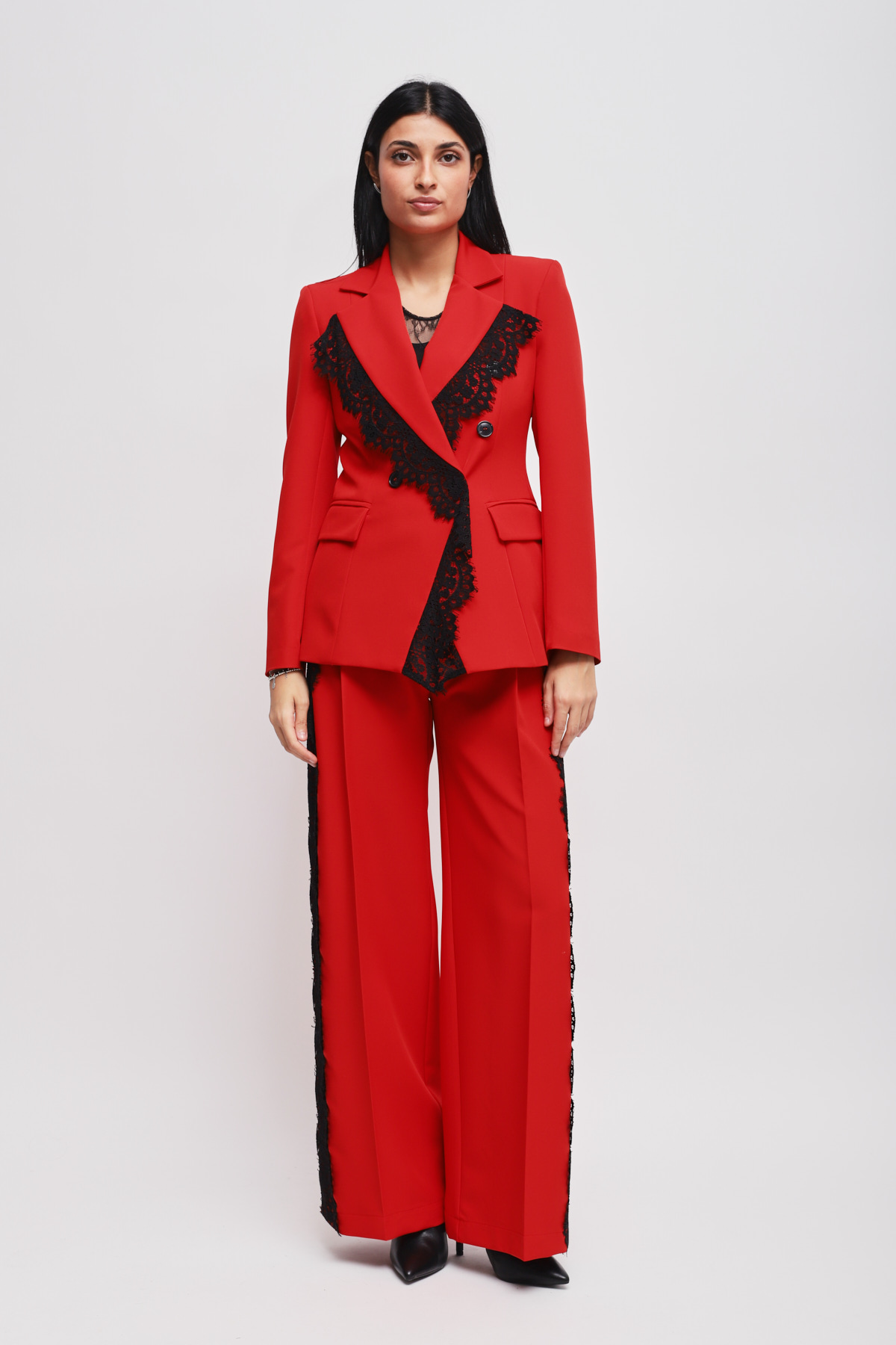 HOME > ABBIGLIAMENTO > COMPLETI E TAILLEUR > COMPLETO GIACCA DOPPIOPETTO E PANTALONE A PALAZZO CON PIZZO