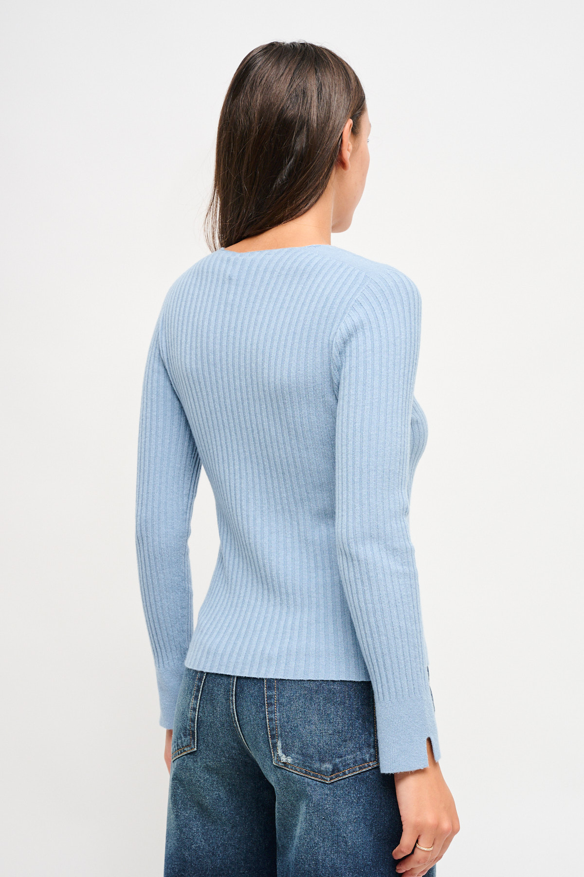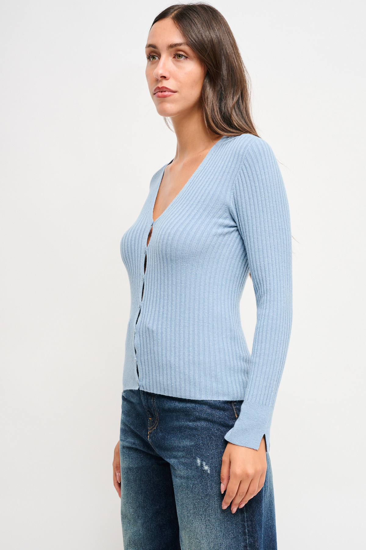 Cardigan a costine dalla linea sottile con scollo a V e chiusura frontale con piccoli bottoni. Il tessuto elasticizzato valorizza la silhouette, rendendolo un capo ideale da indossare da solo o come sottogiacca. Unisce comfort e stile chic, perfetto per completare look quotidiani con denim o pantaloni sartoriali.