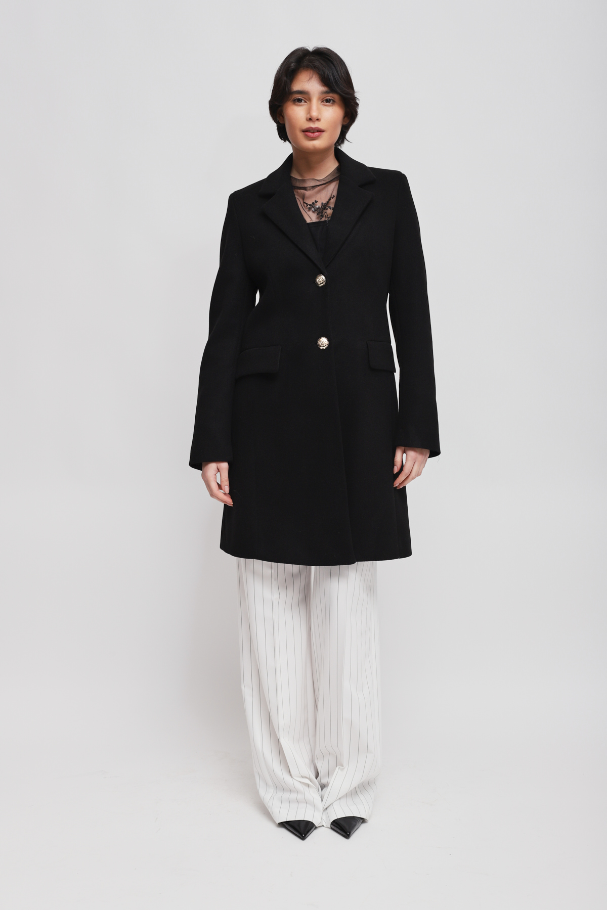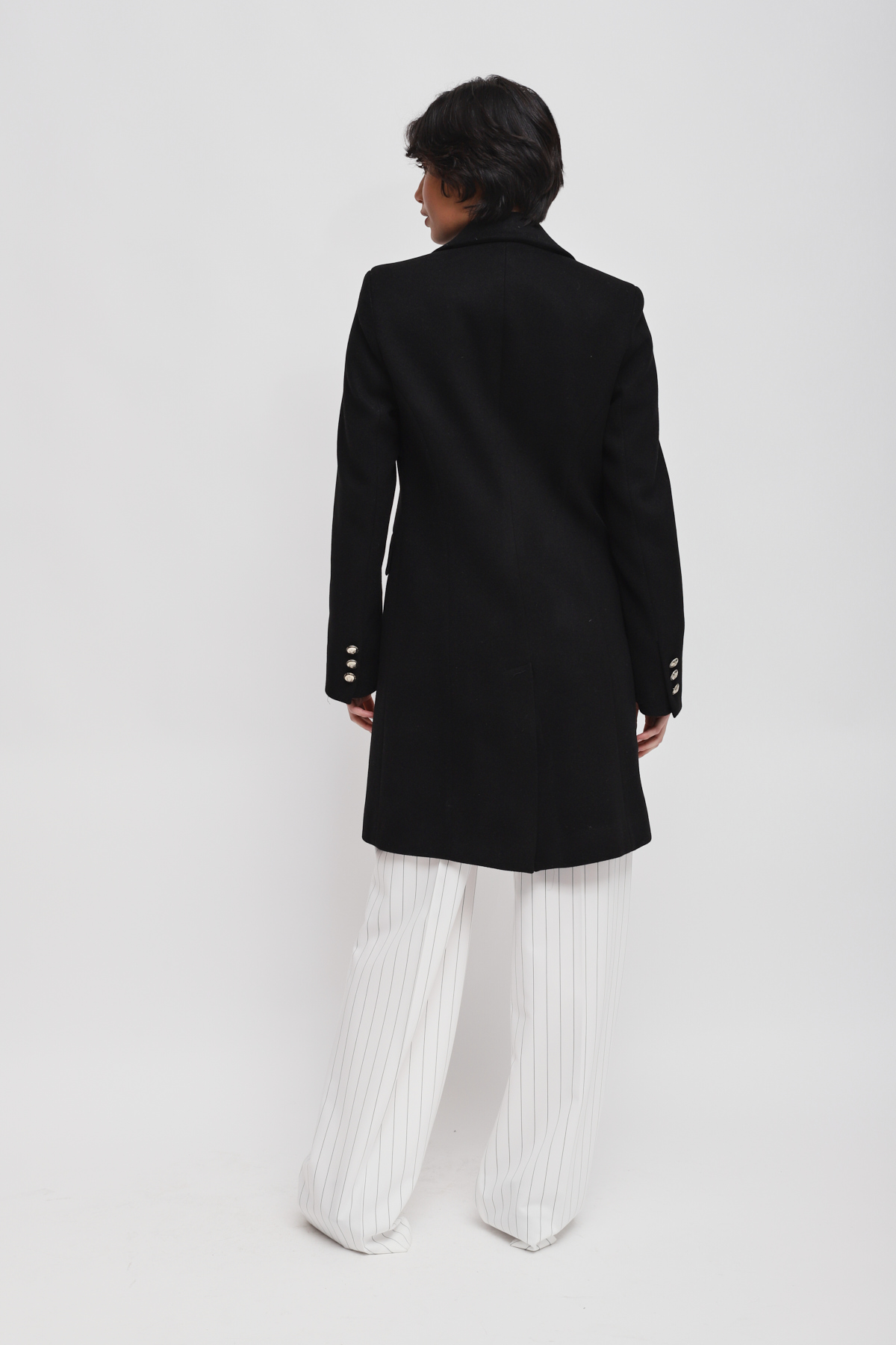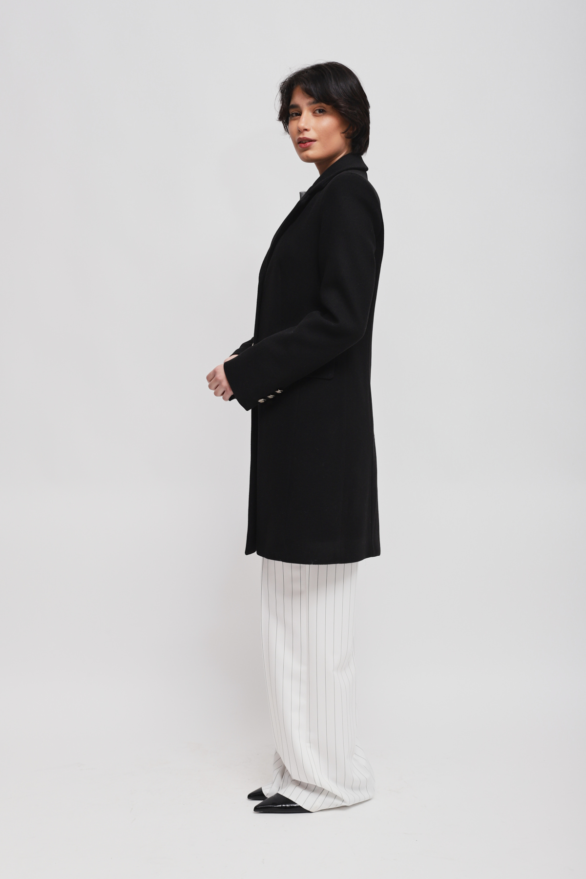 Cappotto dal taglio lungo e avvitato, ideale per definire la silhouette con eleganza. Il design essenziale con revers classici e tasche patte assicura versatilità, perfetto per outfit quotidiani o formali.